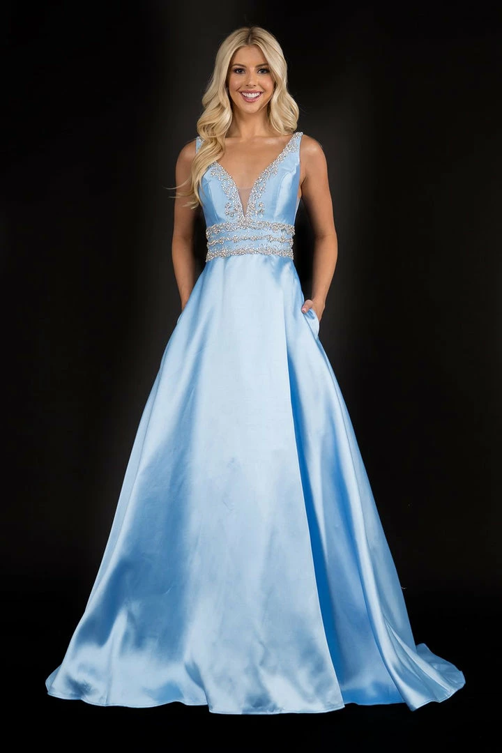 Nina Canacci 2290 Embellished plunging neckline A line prom dress embellished evening gown. Three rows of embellishments around the waistline.