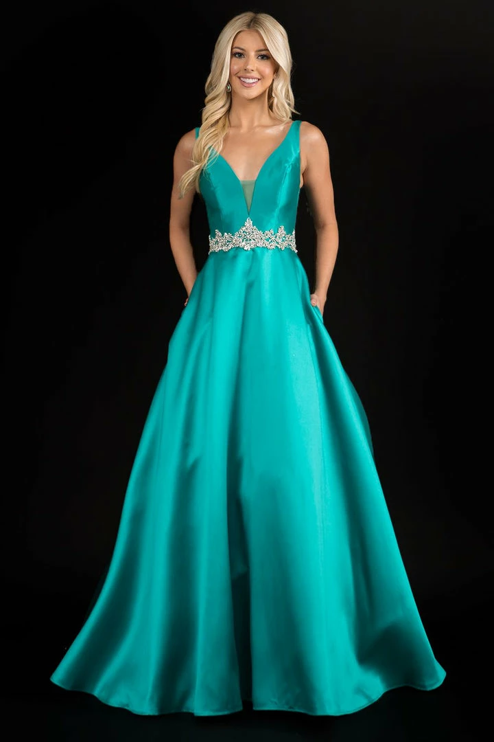 Nina Canacci 2297 plunging neckline A line prom dress formal evening gown with an embellished waistline. Perfect for a wedding dress in Ivory.Â