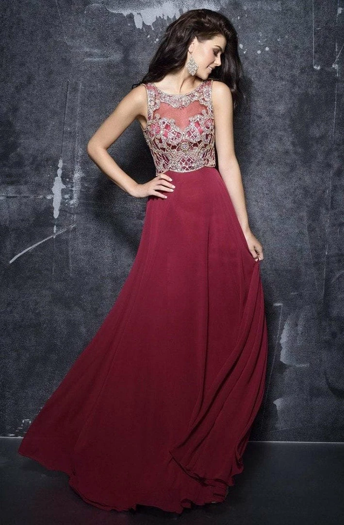 Nina Canacci 3119 is a long A Line Chiffon Formal evening Gown. Featuring an Embellished & Beaded fitted high neckline with a sheer illsuion sweetheart neckline. backless cut out design.
