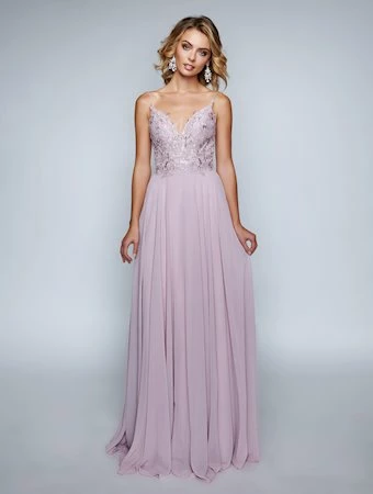 Nina Canacci 3153 Mauve size 4 This is a long flowy prom dress with a lace bodice v neckline. Perfect for wedding guest, bridesmaid, maid of honor or mother of bride or groom dress. Also makes a nice choice for spring formal dance or other social events.Â