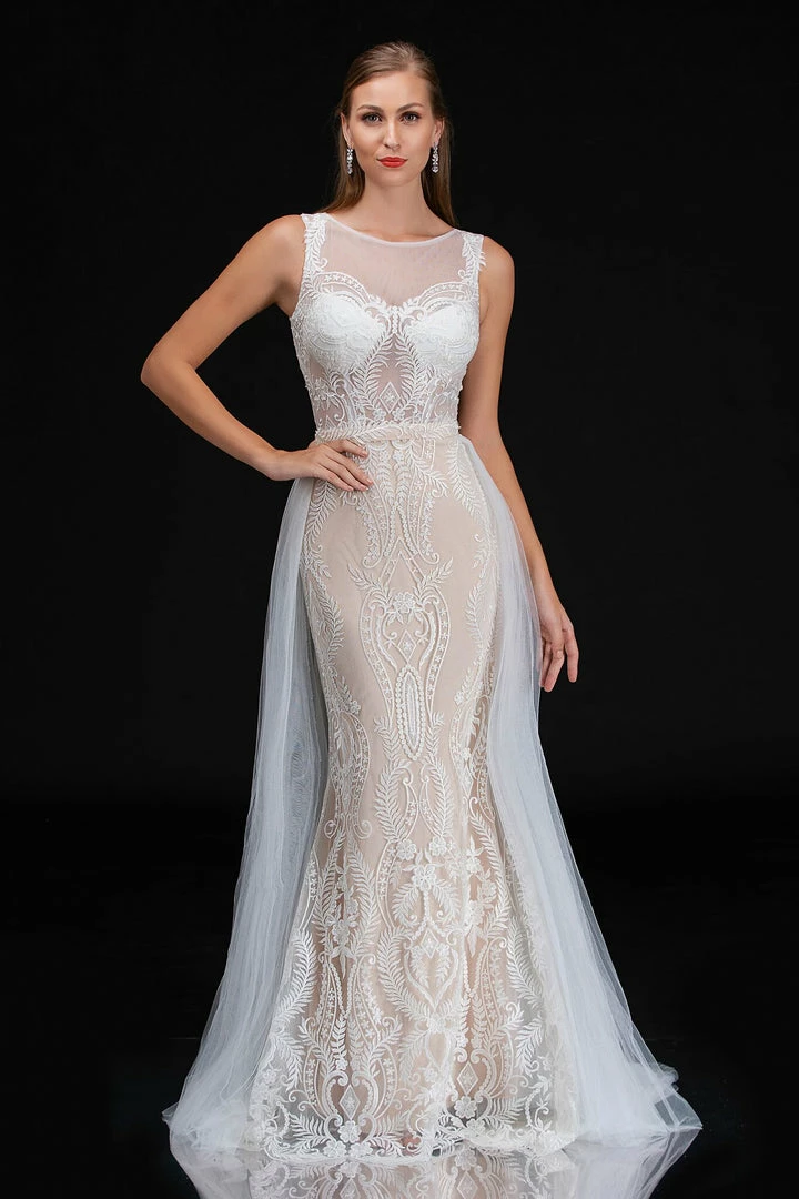 Nina Canacci 4191 is an Ivory & Nude Long Fitted Embroidered Lace Wedding Dress featuring a matching waist belt detachable with a flowing soft tulle overskirt. Open sheer embroidered back. Great destination wedding dress.