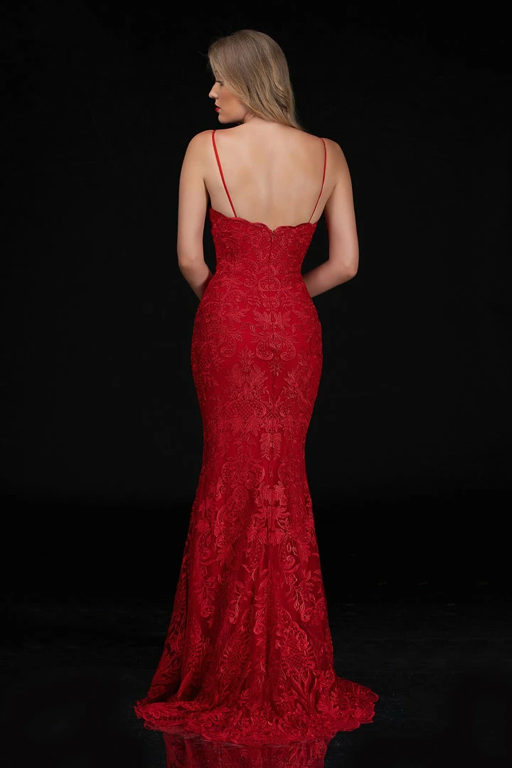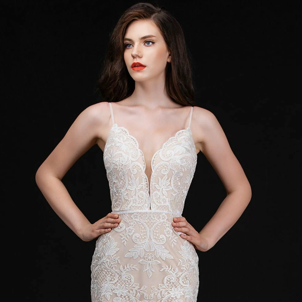 Nina Canacci 4201 is a long fitted Mermaid silhouette prom Dress, Wedding Dress & Formal Evening Gown, Featuring an embellished Embroidered Floral Lace Applique. Scallop lace edges with spaghetti straps. White Collection Bridal GownÂ