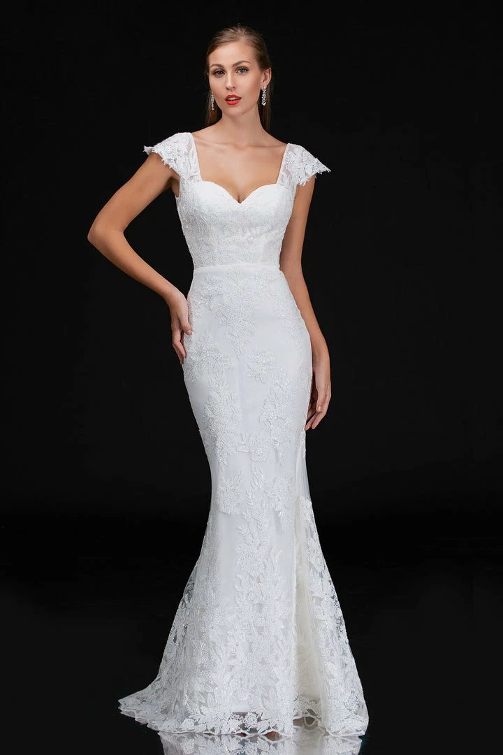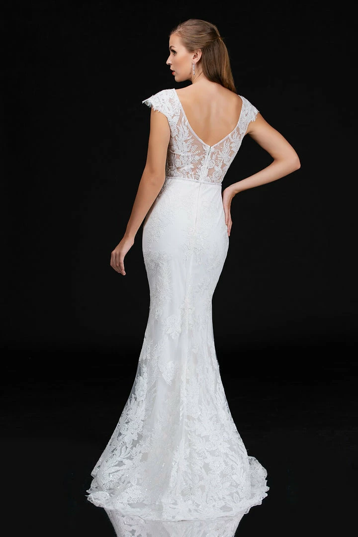 Nina Canacci 4203 is a long fitted embellished lace mermaid wedding dress. featuring a sweetheart neckline with cap sleeves with eyelash lace and a sheer lace back. Great destination bridal gown. Great for Plus Size. Mermaid fit & Flare Silhouette with a trumpet skirt