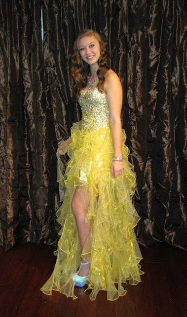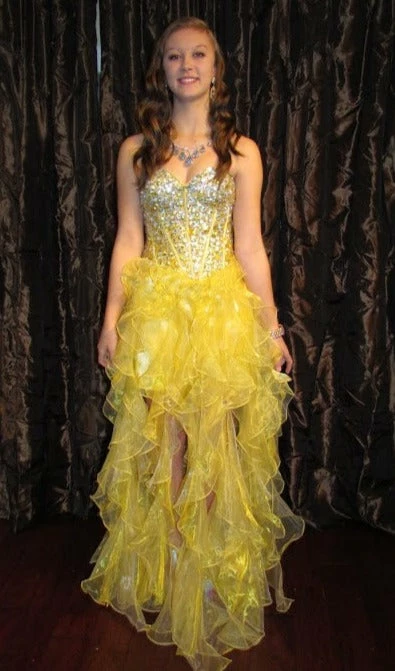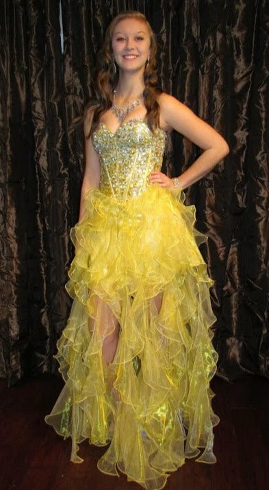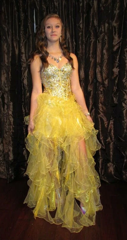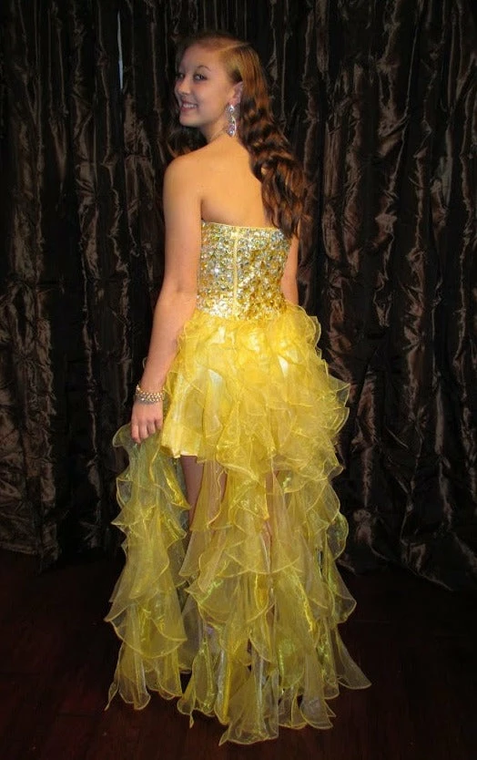 Nina Canacci 5024 Size 4 Ruffle High Low Fun Fashion Formal Dress Short Long Pageant Gown Short dress with ruffle tendrels hanging to create a unique fun fashion high low!