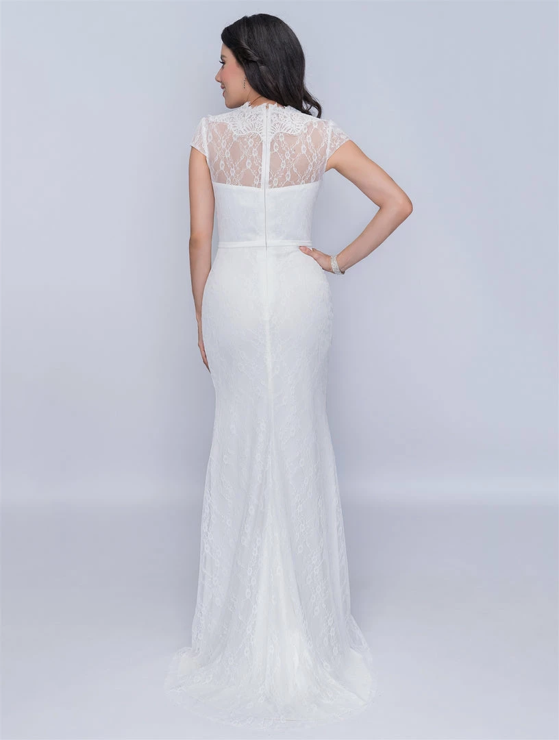Nina Canacci 5139 is a long lace formal Ivory gown with cap sleeves and a sheer back. slit in the front. perfect for wedding or reception.Â