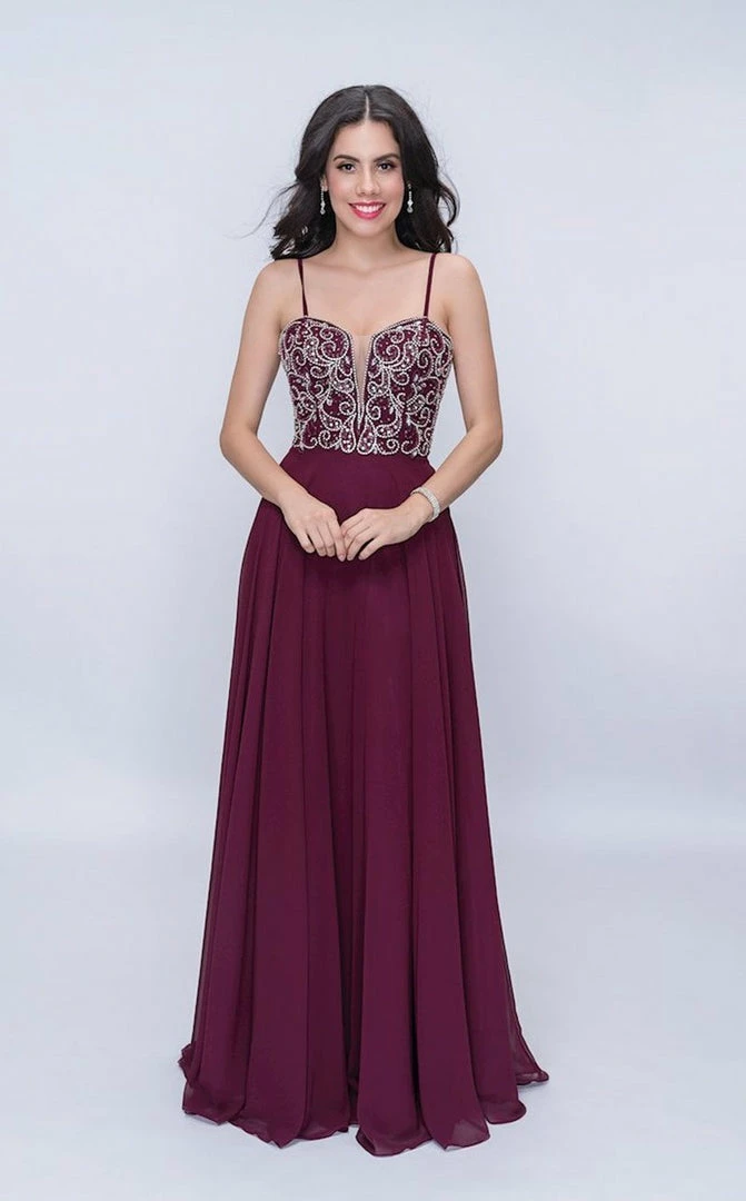 Nina Canacci 6509 Long flowing chiffon A Line Prom Dress. Featuring a Beaded & Crystal Embellished Fitted bodice with a plunging neckline and spaghetti straps.Β