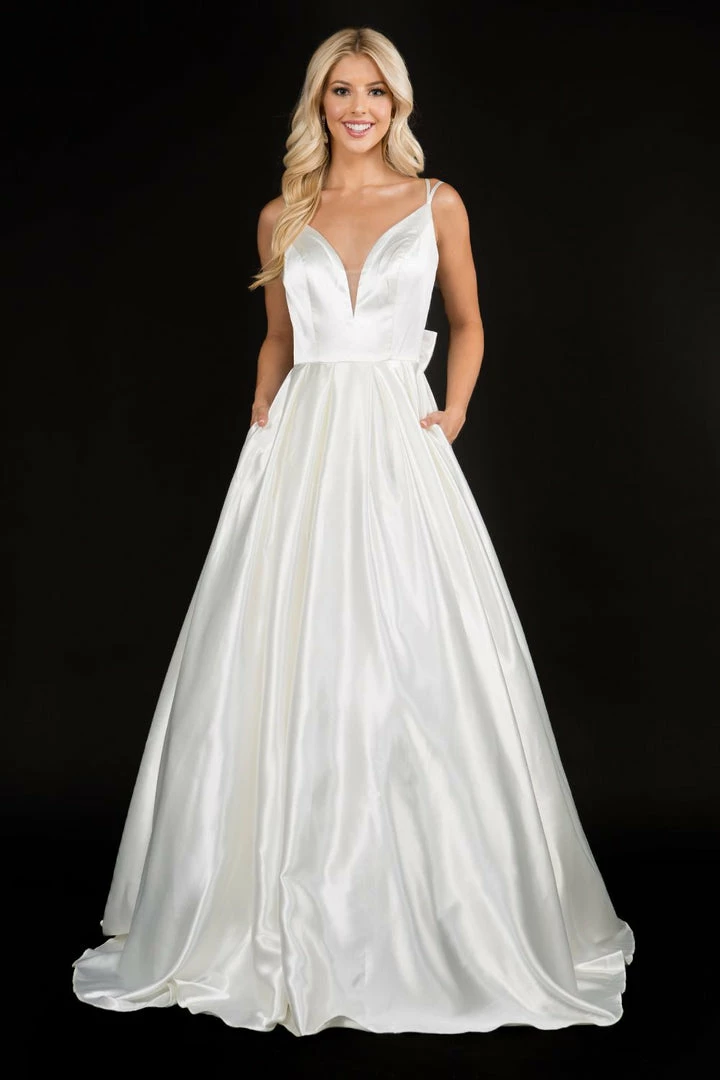 Nina Canacci 6549 Satin bow in back long A line wedding dress bridal gown with plunging v neckline and spaghetti straps