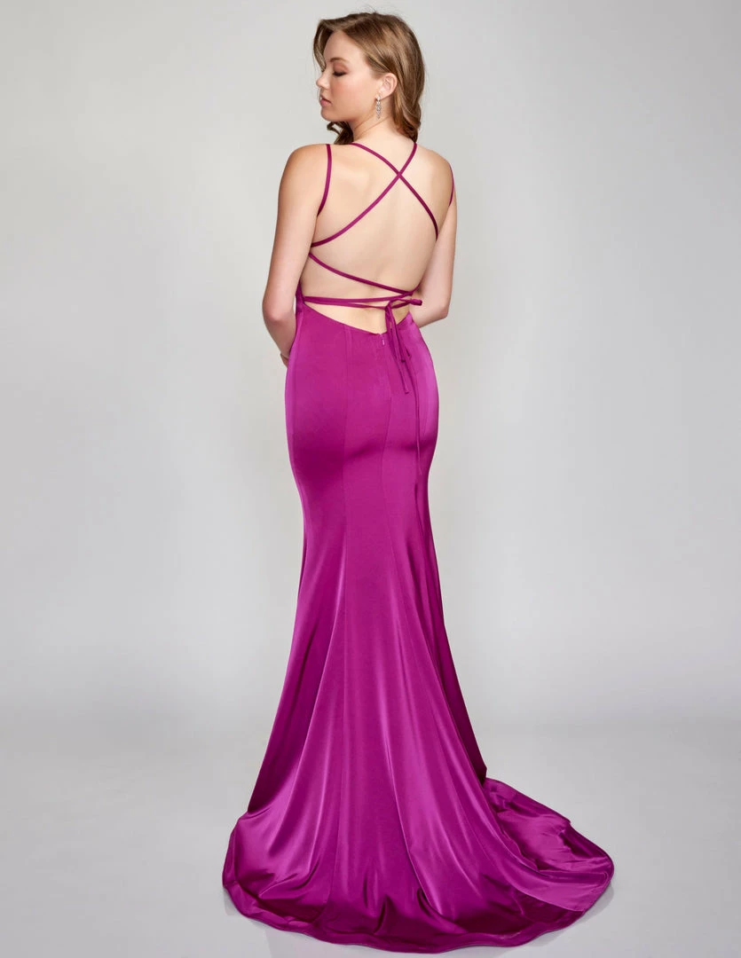 Nina Canacci 9142 This is a gorgeous fitted long prom dress that has a scoop neckline with double spaghetti straps that wrap around and lace up and tie in the open back. The long mermaid skirt has horsehair trim.Â