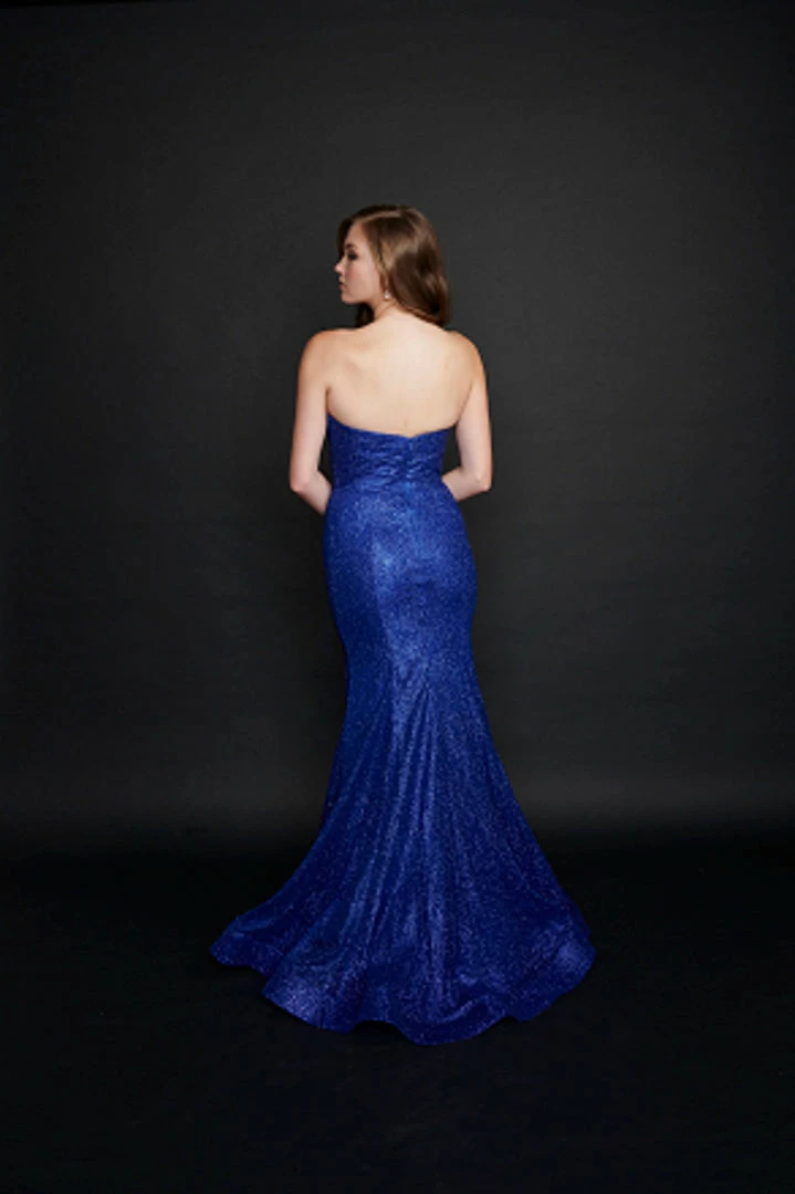 Nina Canacci 9143 This is a royal blue shimmery long mermaid prom dress with a sweetheart neckline and fitted silhouette.Β It has horsehair trim on this gorgeous pageant Gown.