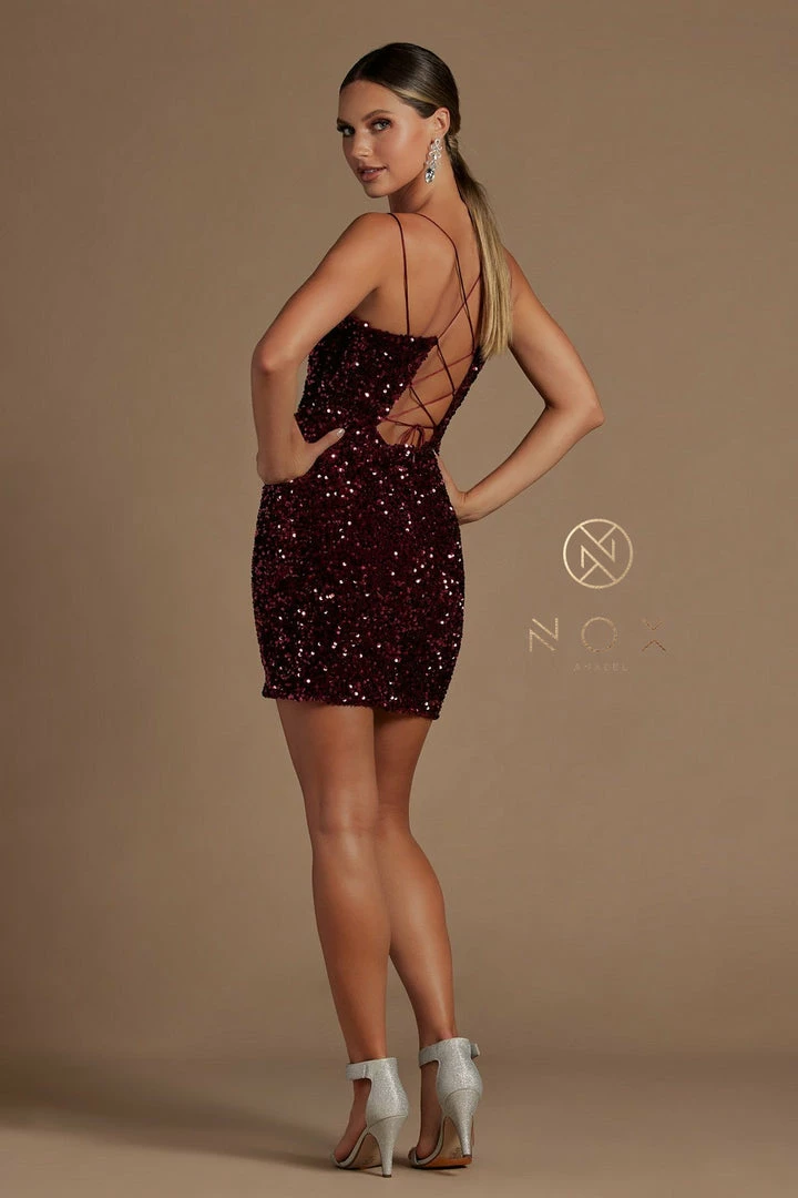 Nox Anabel R704 Short Fitted Sequin Velvet Cocktail Formal Dress Corset V neck GownΒ