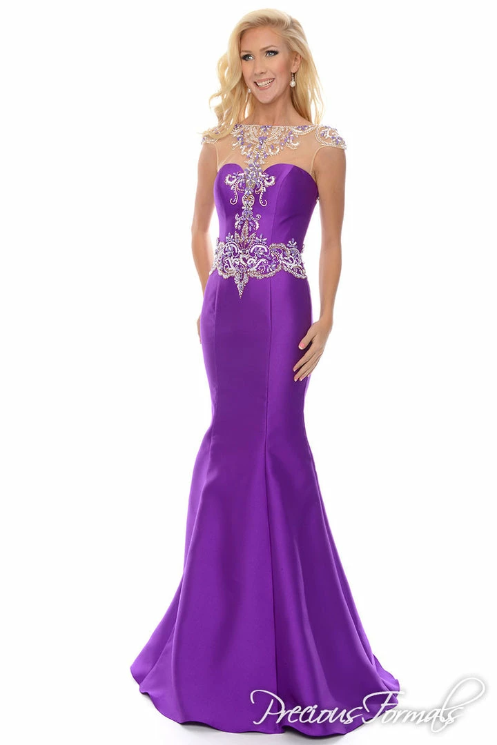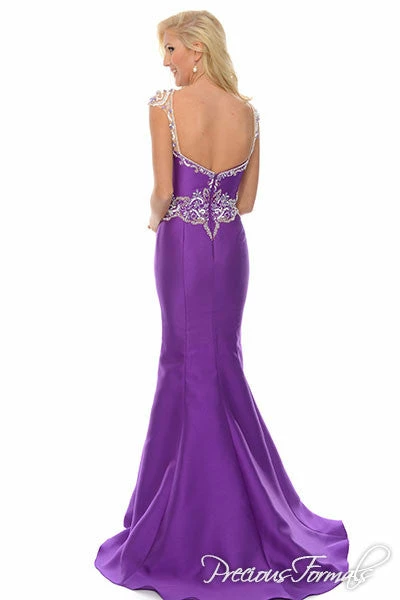 Precious Formals P 70204 is a long elegant mermaid dress with illusion hand beaded top and beaded waist details with cap sleeves and open back.