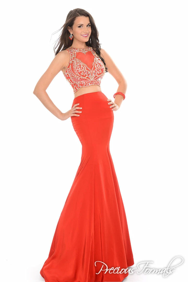 Precious Formals 81014  Red Two piece long fitting Satin mermaid Prom dress with an amazing Beaded & Embellished High neck halter with a sheer illusion neckline.