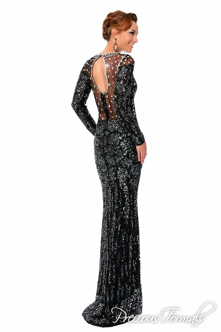 Precious Formals P 9091 is a slim fit fully hand beaded prom dress evening gown with illusion top and fully beaded long sleeves with illusion waist design and side slit.