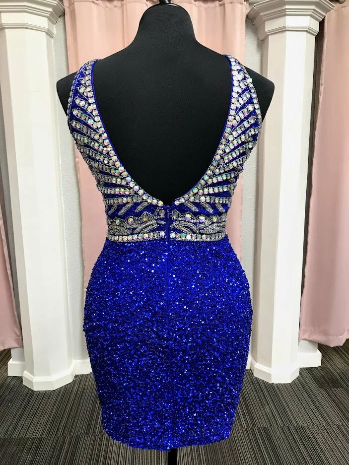 PRIMAVERA COUTURE 1692 is a short fully embellished cocktail formal evening gown. Featuring a fully sequin embellished fitted skirt with a fully beaded & Crystal Embellished upper bodice with a sheer illusion high neckline with detailed beading. an open cutout back. this backless homecoming dress is sure to shine!