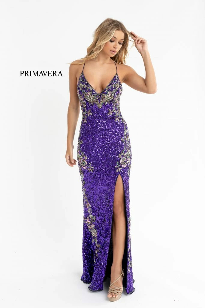 Primavera Couture 3211 is a Long fitted sequin Embellished Formal Evening Gown. This Prom Dress Features a deep V Neck with an open Corset lace up back. Beaded & Embellished elegant scroll pattern accentuate curves. Fully beaded prom dress with floral pattern and side slit. Long Sequin Gown featuring a v neckline. slit in the fitted skirt, Slit in Thigh. Stunning Pageant Dress, Prom Gown & More!