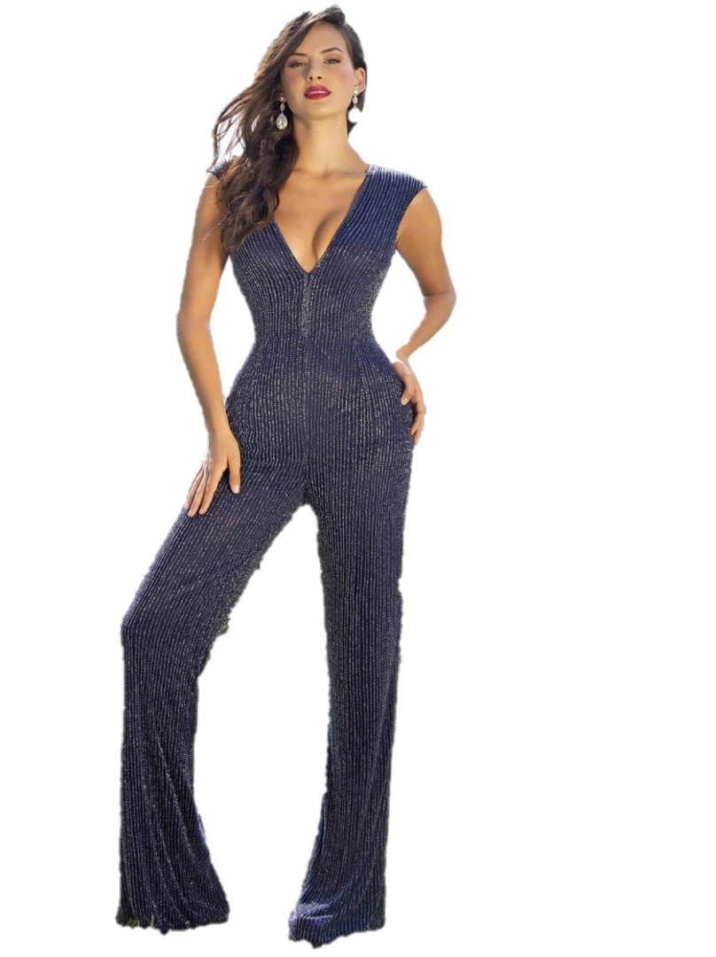 Wide straps with covered back hand beaded jumpsuit formal evening wear pageant wear. Beaded Long Formal Jumpsuit V Neck Evening Wear