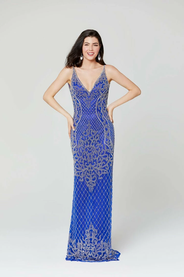 Primavera Couture 3415 spaghetti straps prom dress with v neckline beaded design evening gown with open low scoop back and long skirt show the beaded work on the hem of the dress. Hand Beaded & Embellished V Neck Formal Evening Gown Pageant Dress