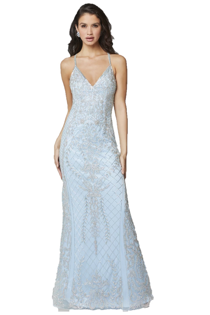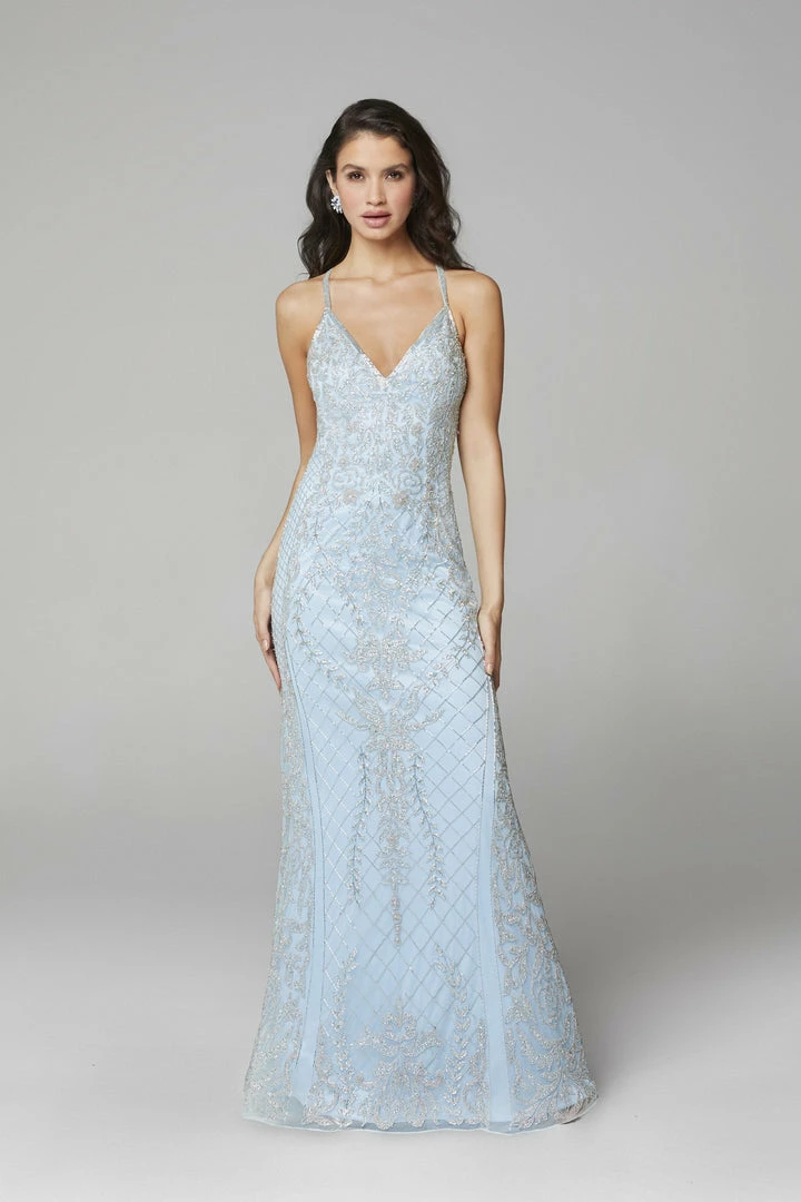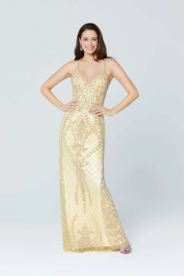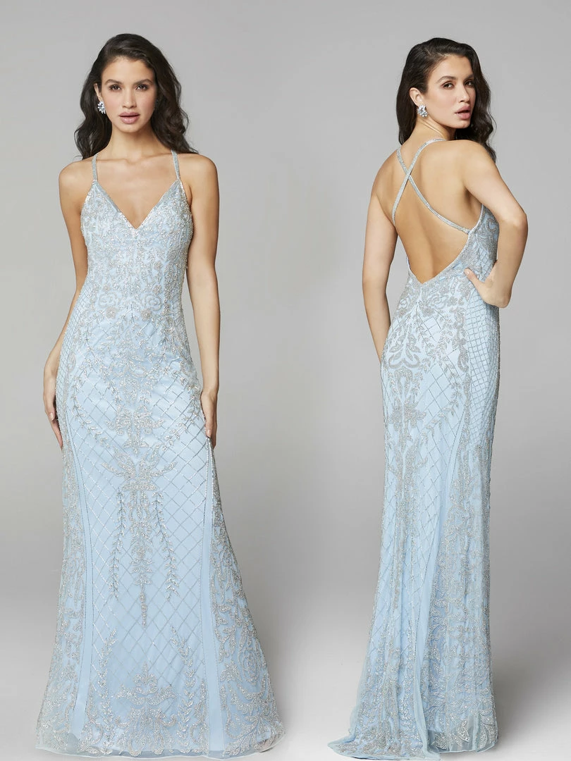 Primavera Couture 3428 is a beaded sequins Prom Dress, Pageant Gown, & Formal Evening Wear gown. This long Gown Features a v neckline with spaghetti straps that criss cross in the open backΒ