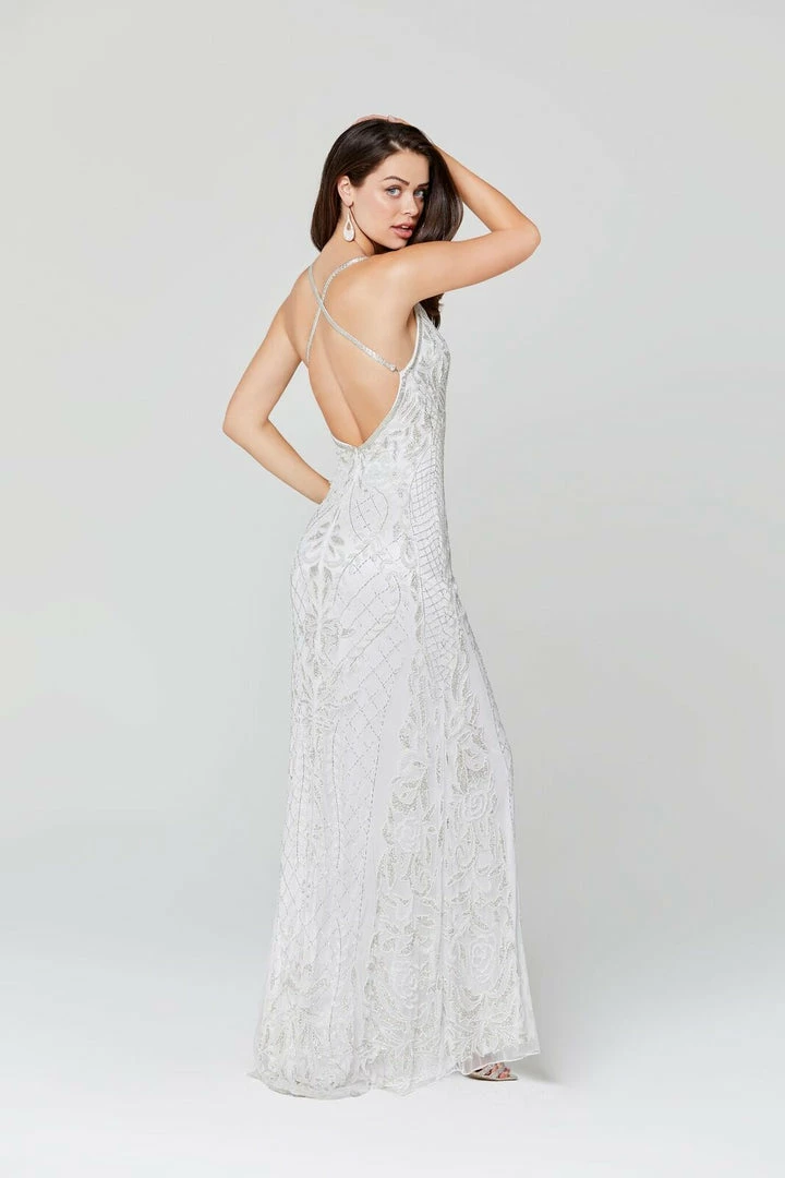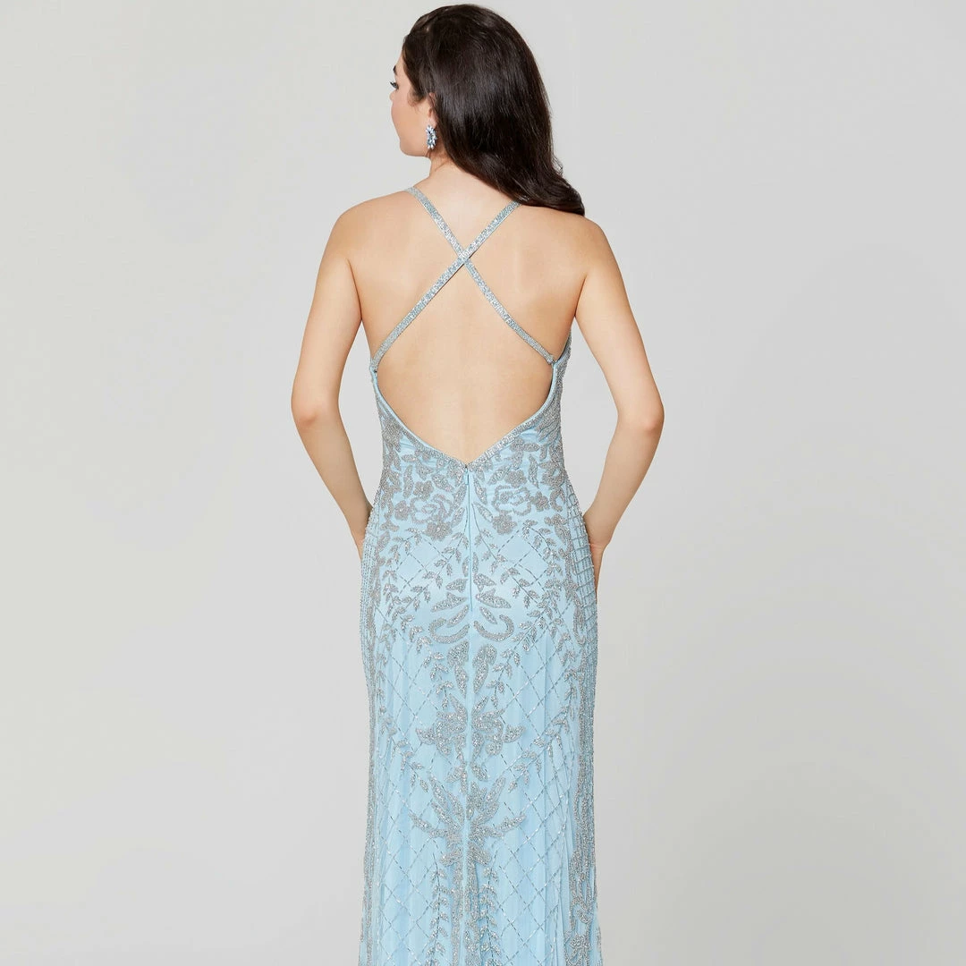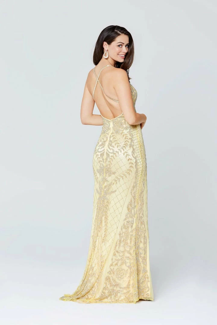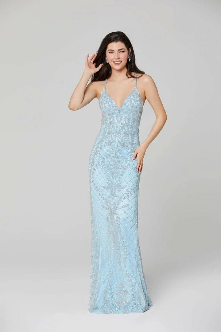 Primavera Couture 3428 is a beaded sequins Prom Dress, Pageant Gown, & Formal Evening Wear gown. This long Gown Features a v neckline with spaghetti straps that criss cross in the open backΒ