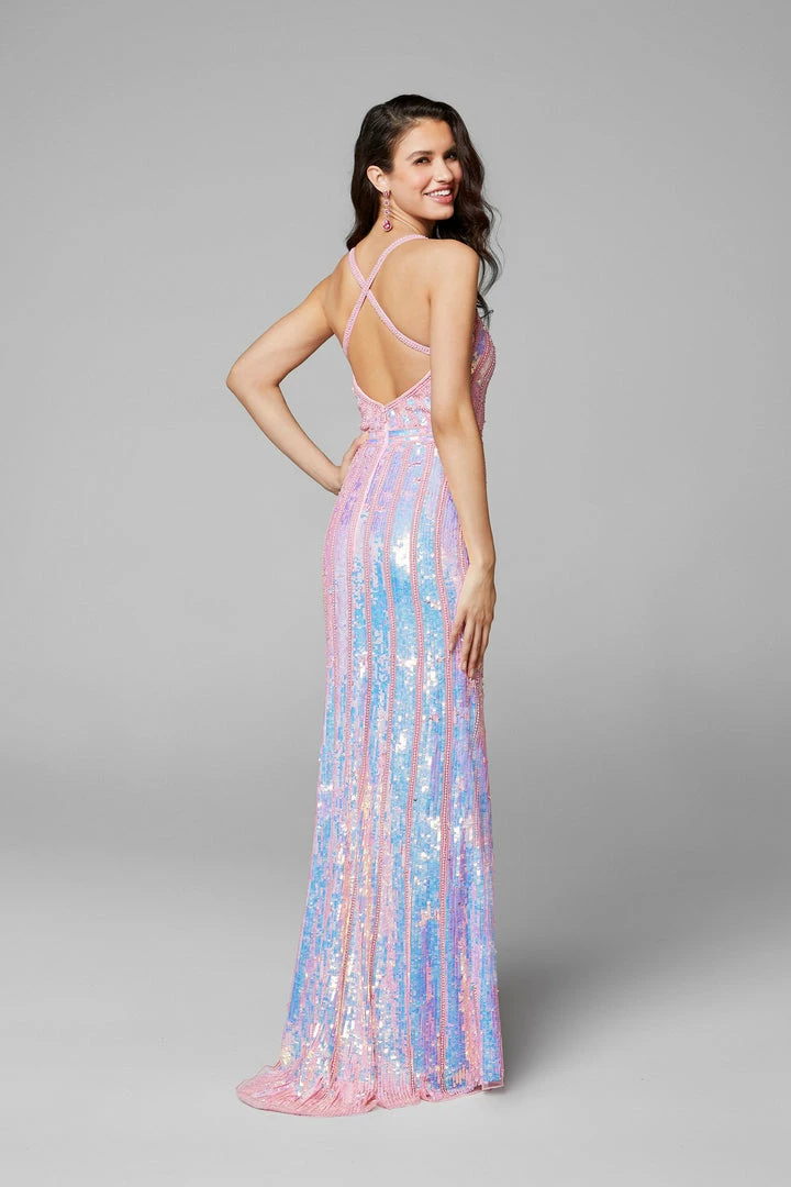 Primavera Couture 3441Â is a iridescent sequins long formal Prom Dress, Pageant Gown, Wedding Dress & Formal Evening Wear gown. Featuring a v neckline with Iridescent Multi sequins and Hand Embellishments. This evening gown is perfect for any formal event! Slit in skirt.