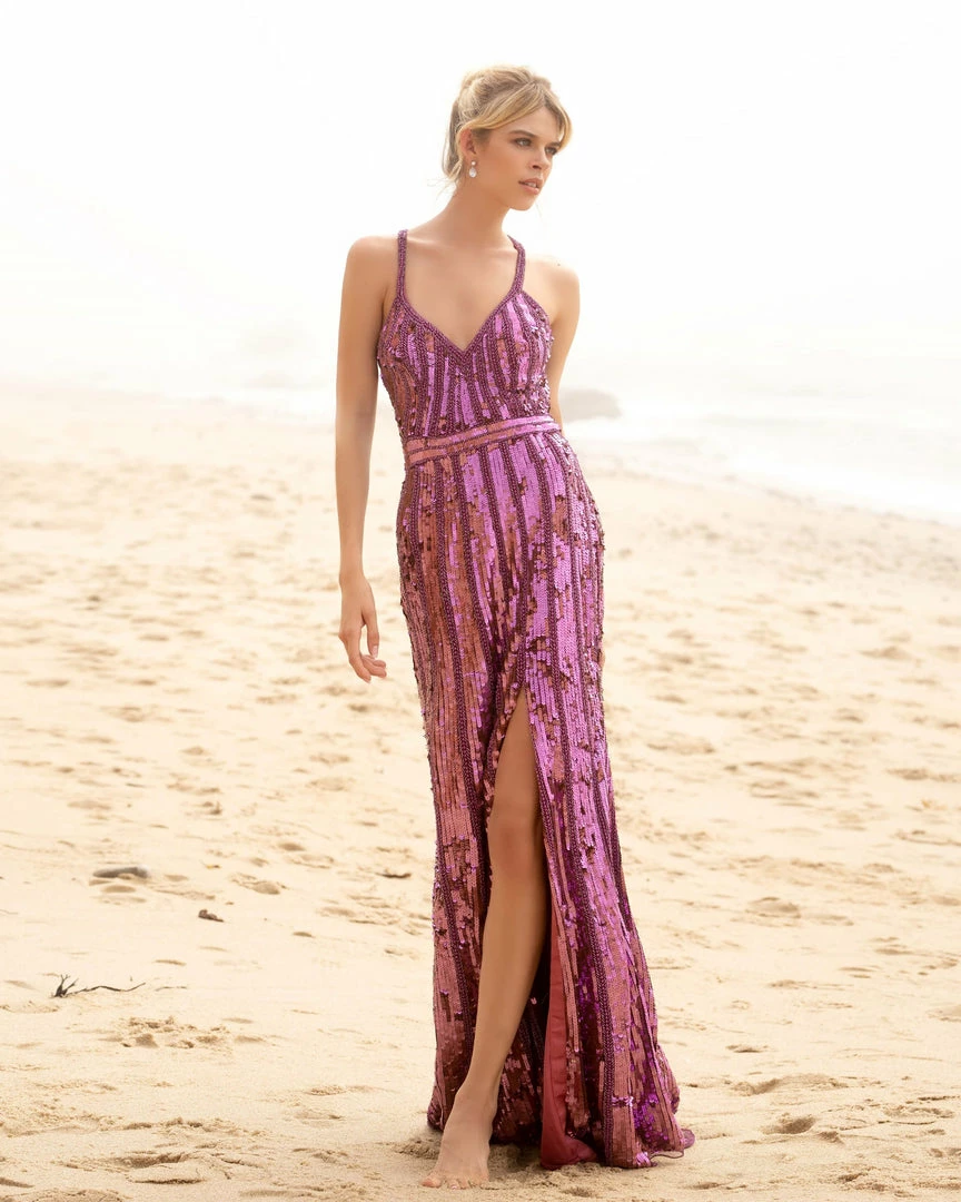 Primavera Couture 3441Β is a iridescent sequins long formal Prom Dress, Pageant Gown, Wedding Dress & Formal Evening Wear gown. Featuring a v neckline with Iridescent Multi sequins and Hand Embellishments. This evening gown is perfect for any formal event! Slit in skirt.