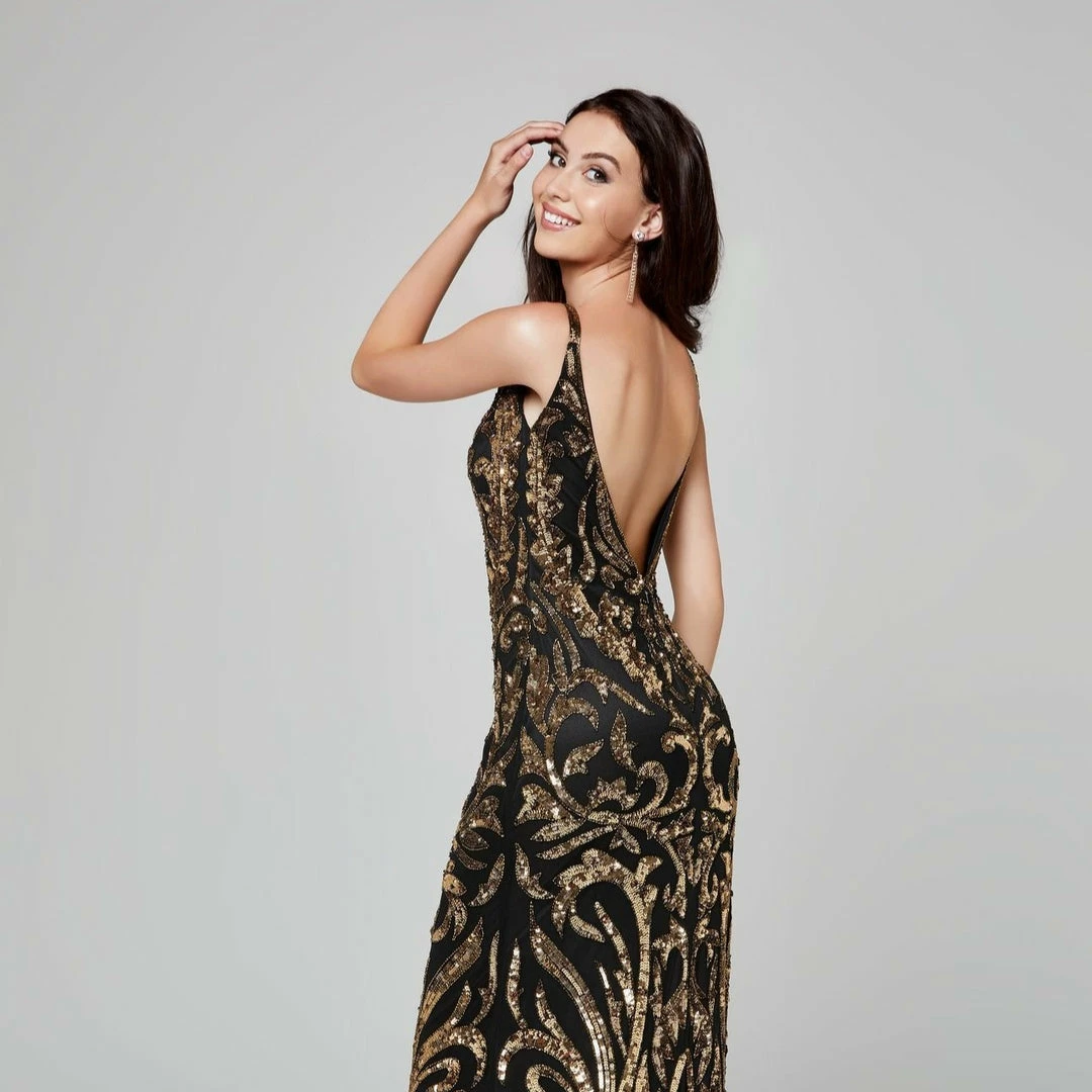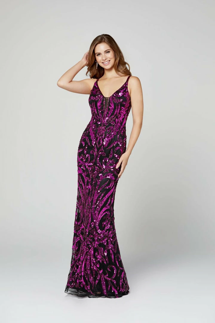 Primavera Couture 3454 is a Beaded Sequins Designer Prom, Pageant & Formal Dress. Featuring a Plunging V neckline with mesh panel. Embellished sequins & Hand beading along the entire gown in a damask print. Great evening gown. Open scoop back.