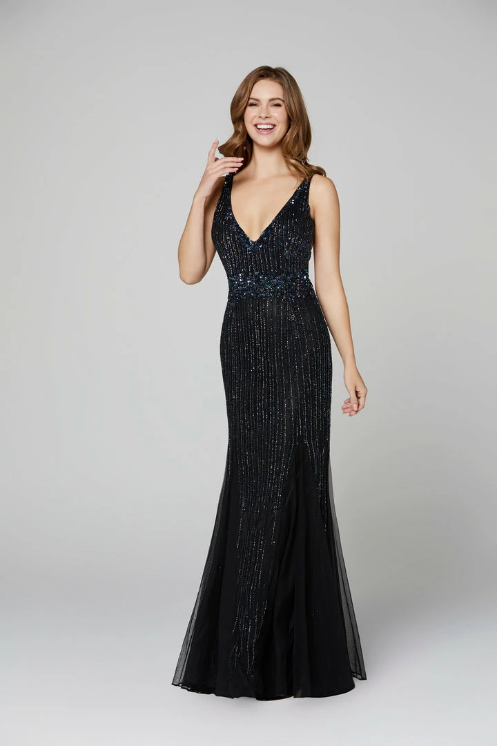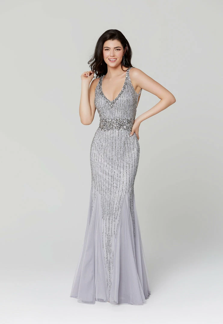 Primavera Couture 3474 V neckline criss cross straps sequin mermaid prom dress pageant gown evening dress with godet style tulle mermaid skirt.Â