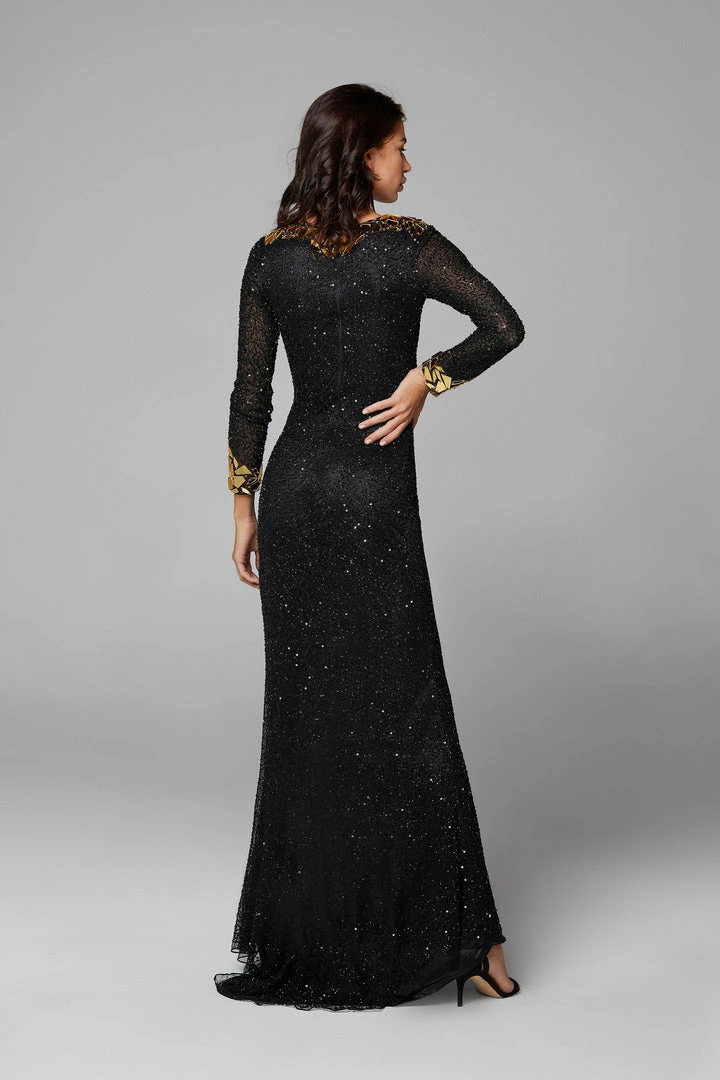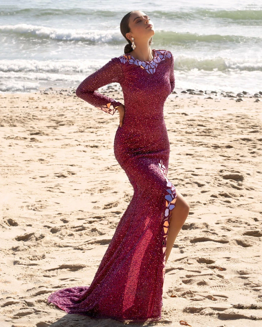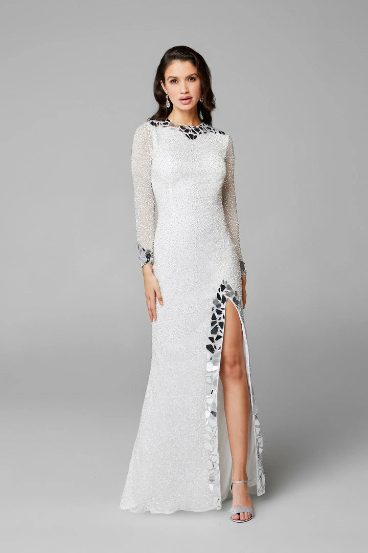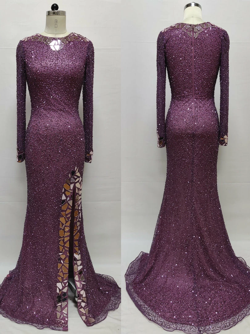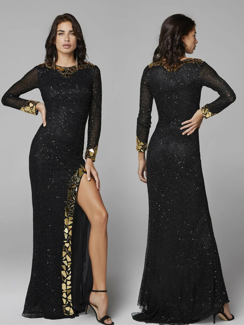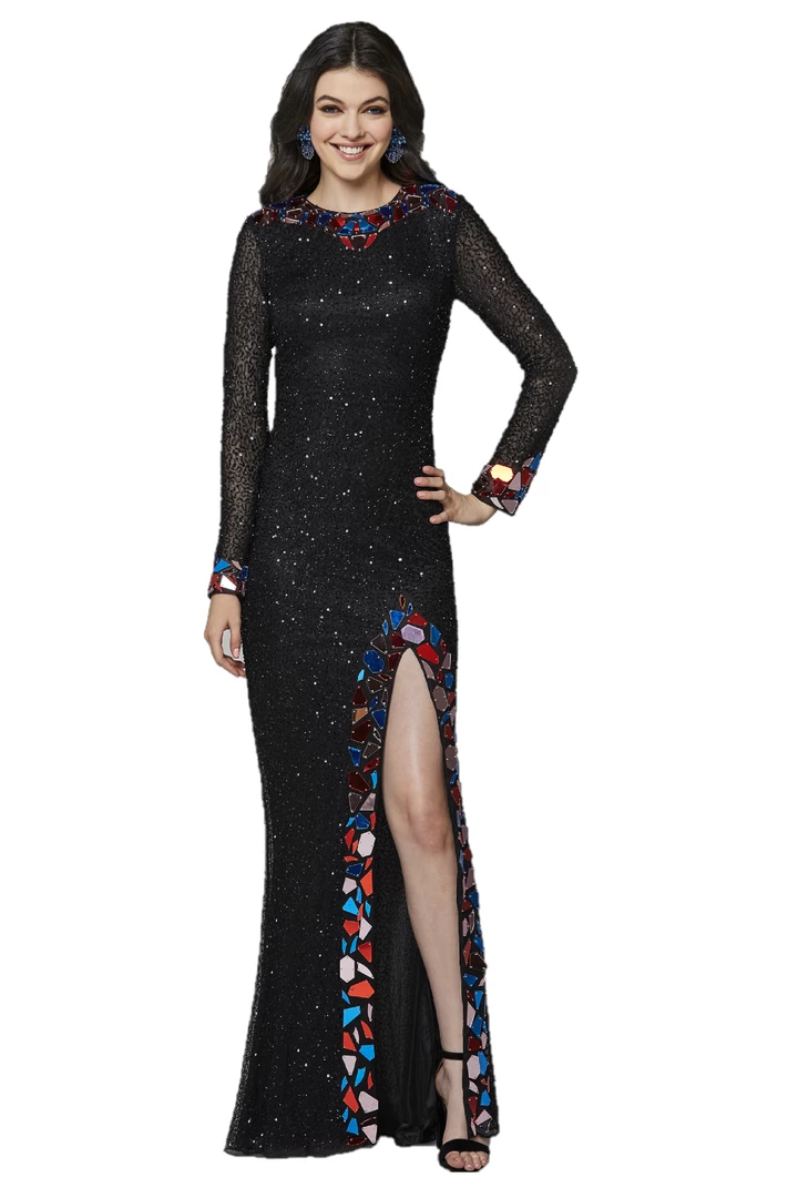Primavera Couture 3614 is a long sleeve fitted fully Embellished formal prom dress evening gown. Featuring a high neckline and long sheer sleeves. This gown is accented with cut glass pieces around the neckline, end of sleeves & Around the slit on this stunning Prom & Pageant Evening Gown. Sweeping train.