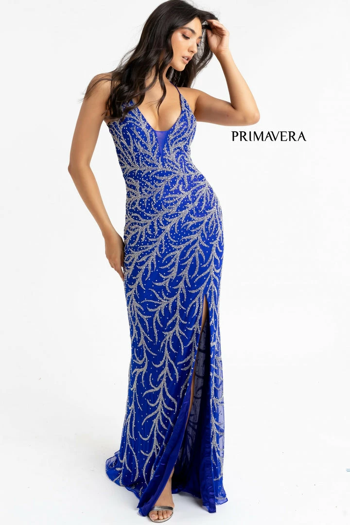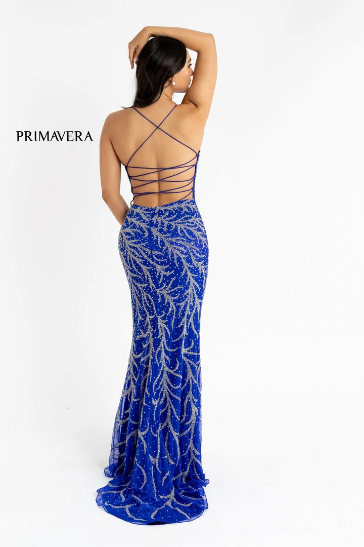 Primavera couture 3636 is a long fitted formal evening gown. This Prom Dress Features a deep V Plunging neckline with mesh insert and spaghetti straps leading around to an open back with a corset lace up tie closure. This Backless Pageant gown Features Beaded Embellishments cascading down the length of the dress. The skirt has a slit & Sweeping train.