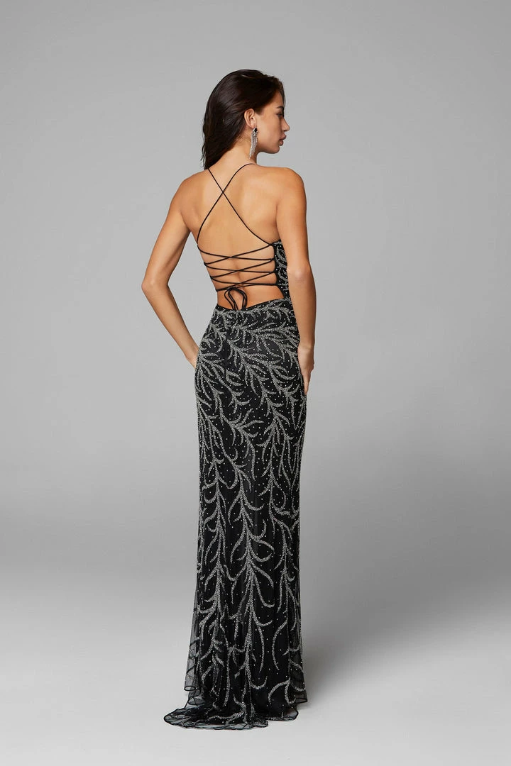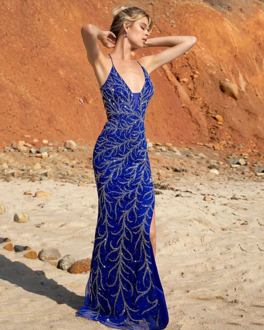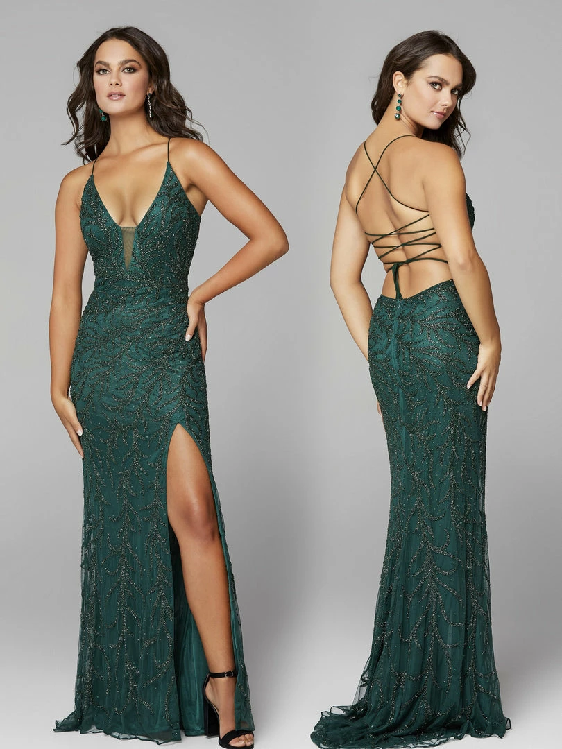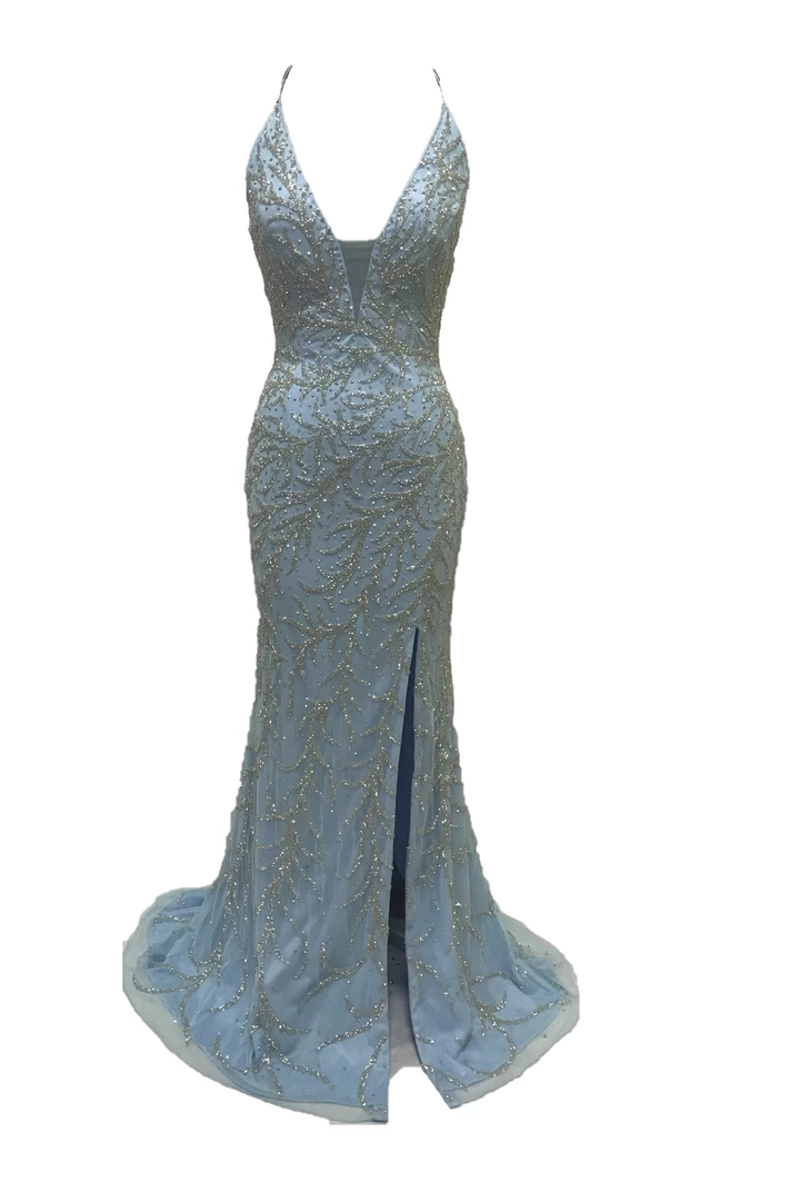 Primavera couture 3636 is a long fitted formal evening gown. This Prom Dress Features a deep V Plunging neckline with mesh insert and spaghetti straps leading around to an open back with a corset lace up tie closure. This Backless Pageant gown Features Beaded Embellishments cascading down the length of the dress. The skirt has a slit & Sweeping train.