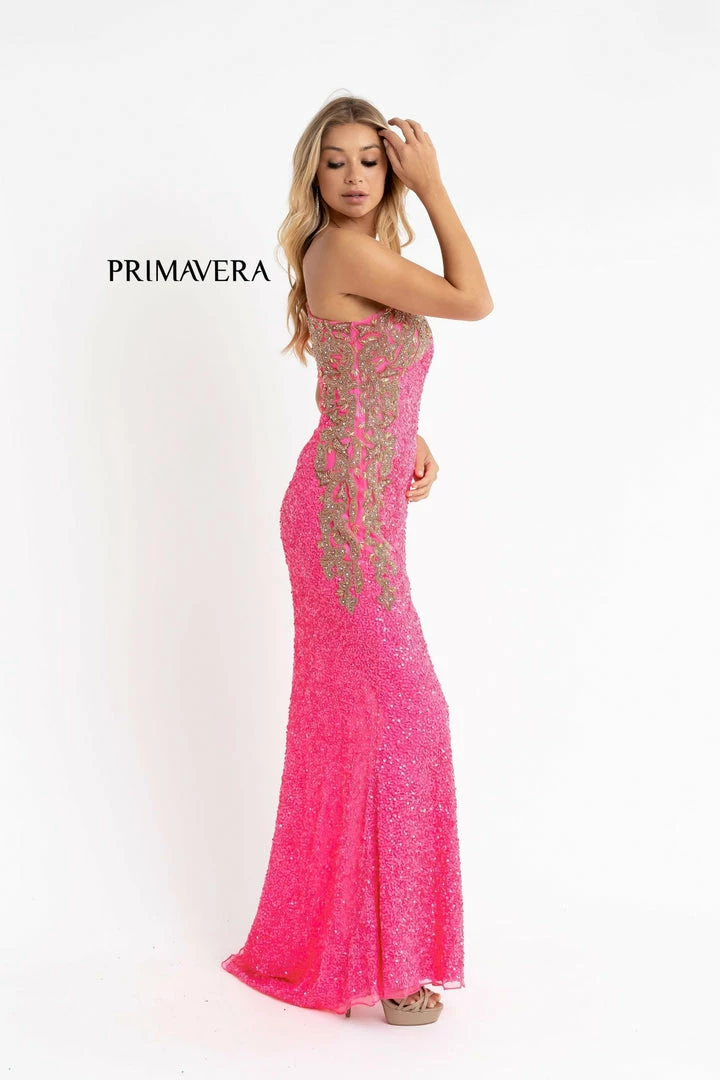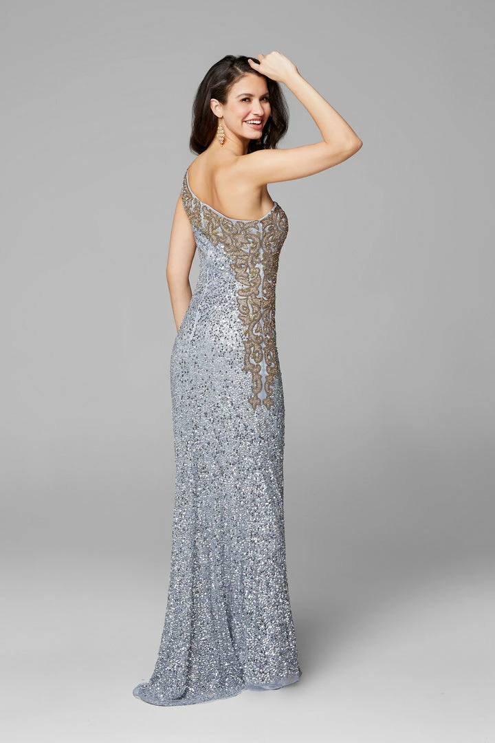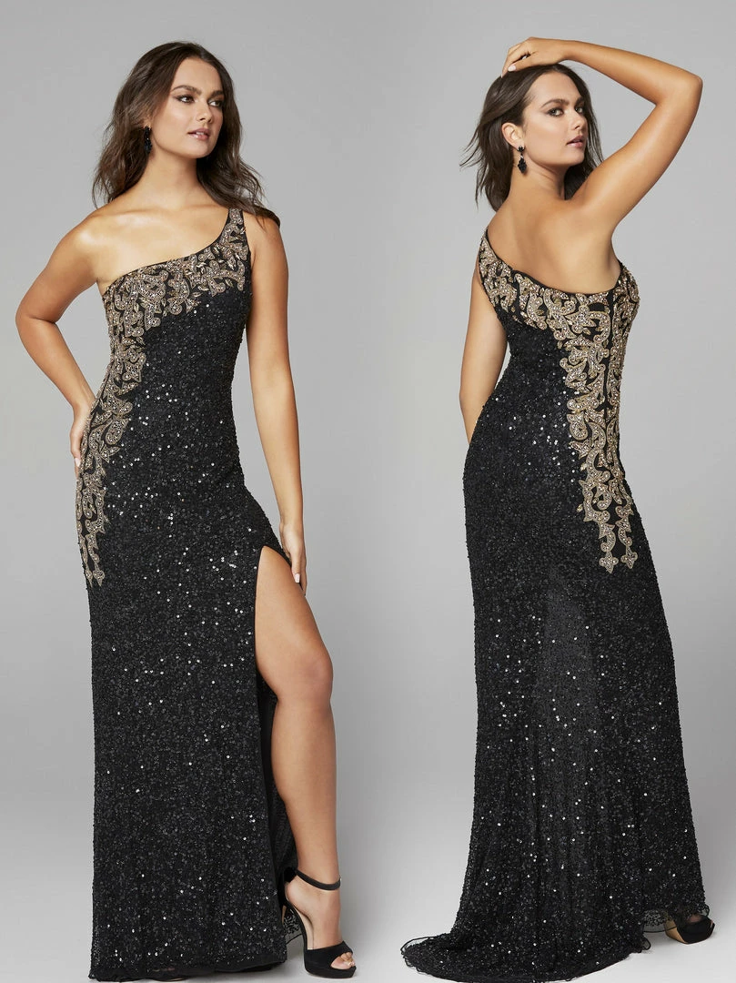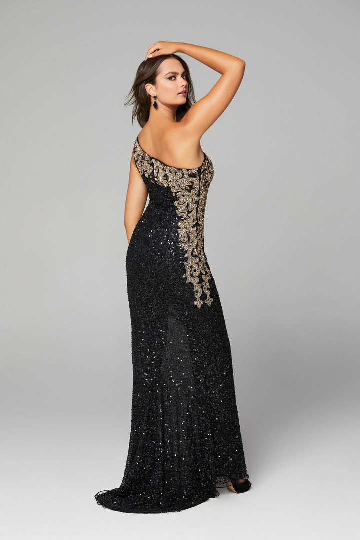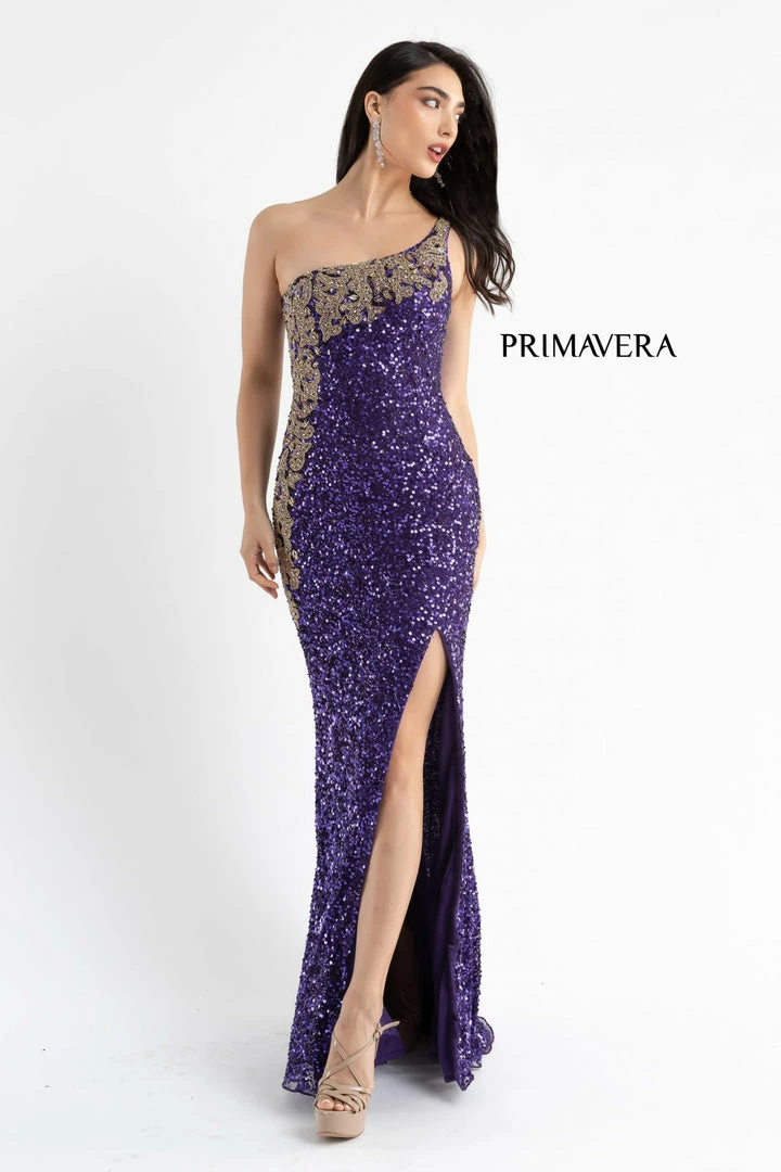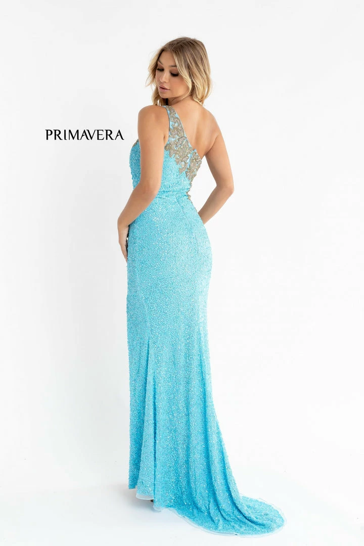 Primavera Couture 3637 is a stunning Long Fitted Sequin Embellished Formal Evening Gown. This One Shoulder Prom Dress Features Beaded Embellishments cascading from the one shoulder neckline down the side of the gown along the hip. Slit in skirt with a sweeping train. Great Pageant Formal Style.
