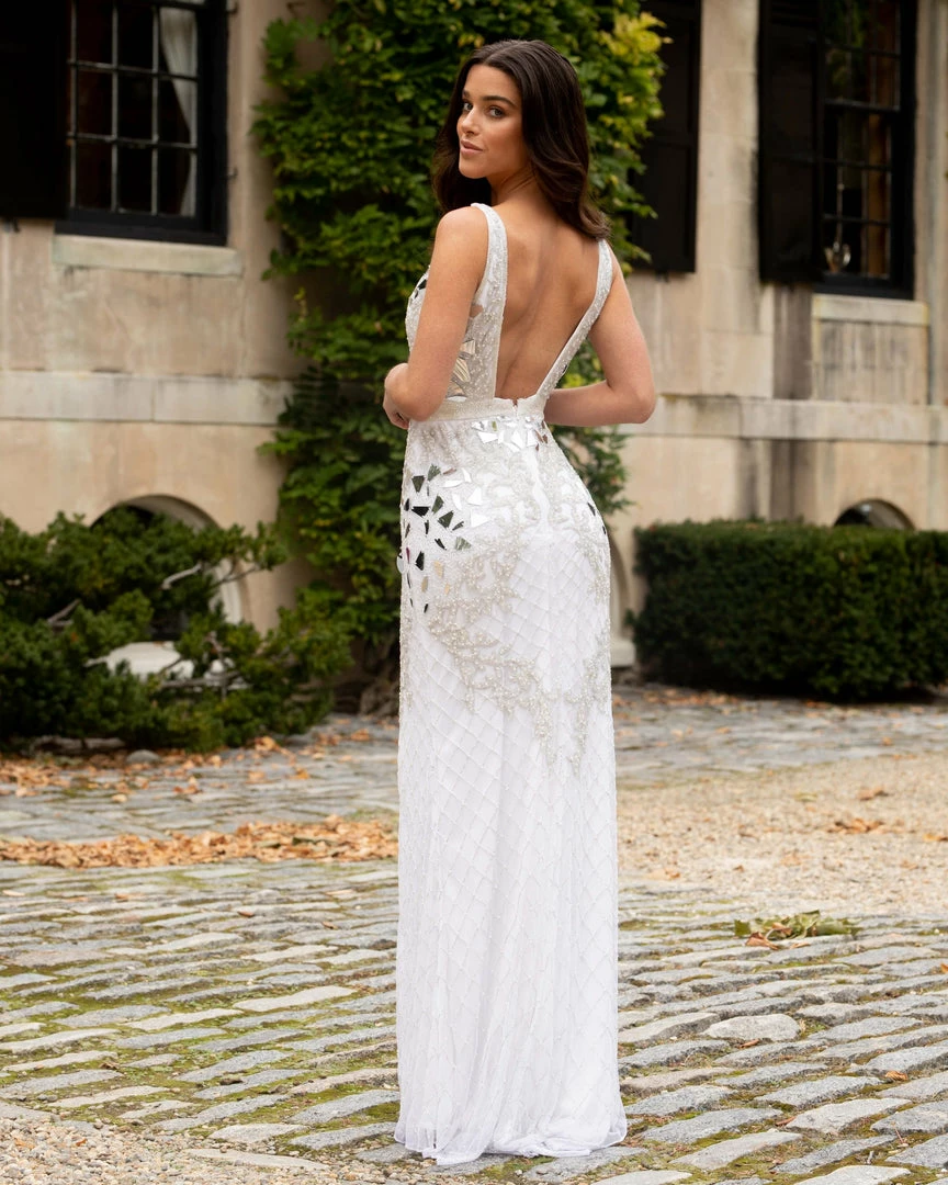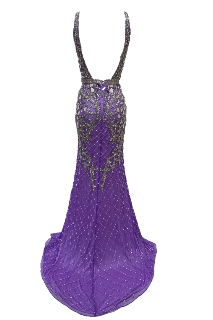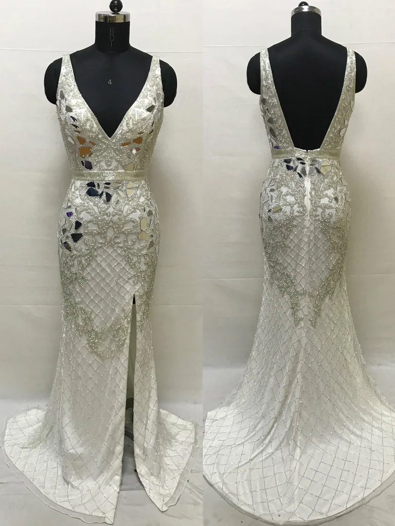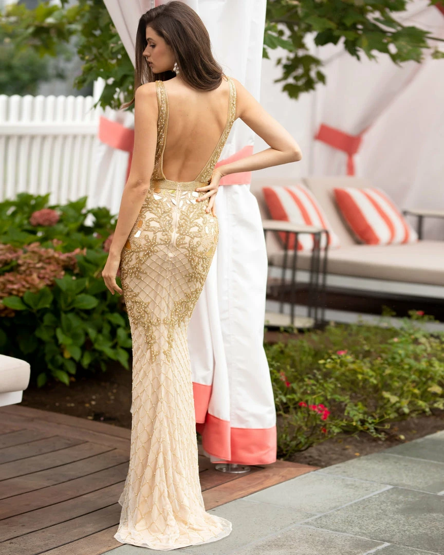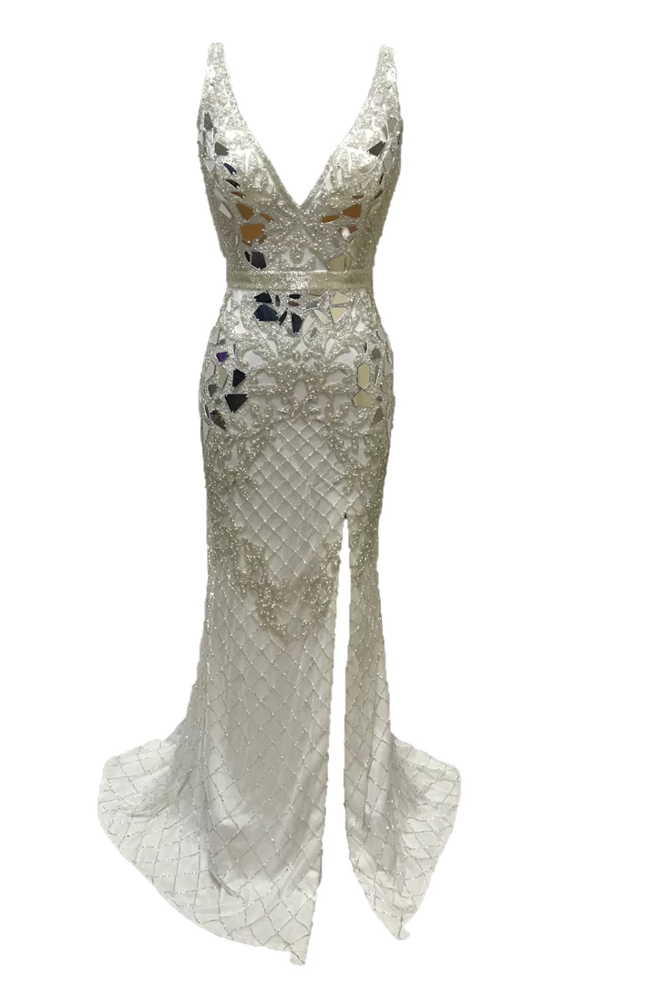 Primavera Couture 3640 is a stunning Long Fitted Formal Evening Gown. Great for Prom, Pageants & More! V Neckline with an open back. Fully beaded & Embellished with Cut Glass Accents along the fitted bust. Floral scroll details with beading & Sequins. Slit in skirt. Great wedding reception dress in Ivory!