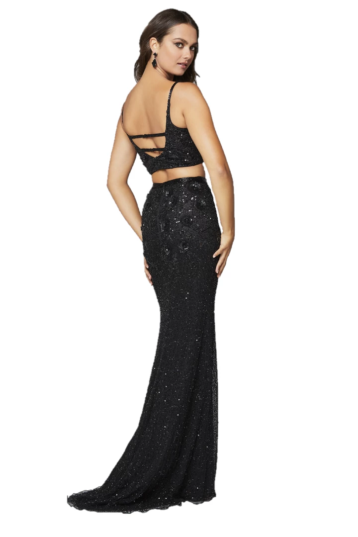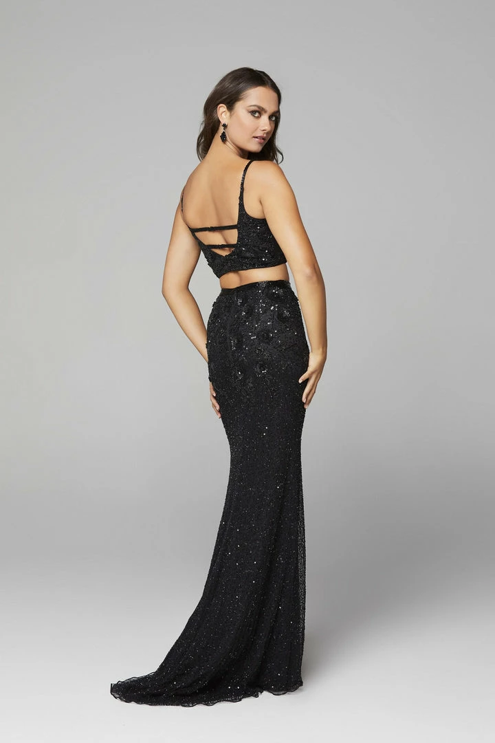 Primavera Couture 3647 is a long fitted two piece formal evening prom dress. Featuring a fitted v neckline bodice with an open back, The skirt has Liquid beaded waist line and a slit & sweeping train. Fully Embellished with beading & Sequins. Detailed Floral patterns are formed and scattered throughout the Pageant gown.Â