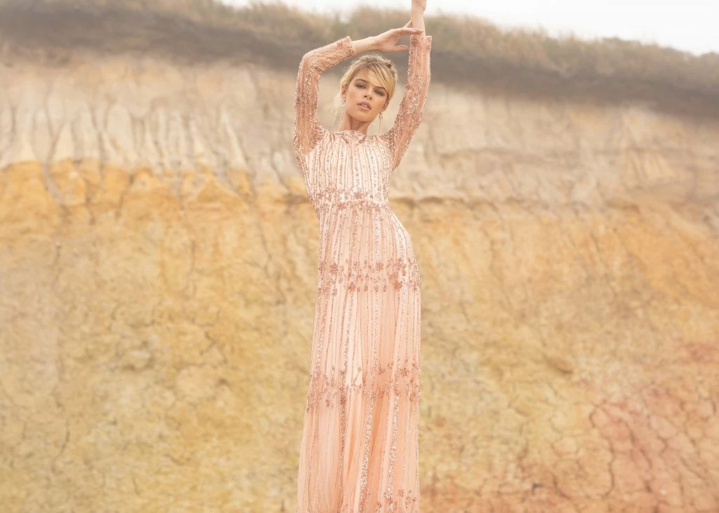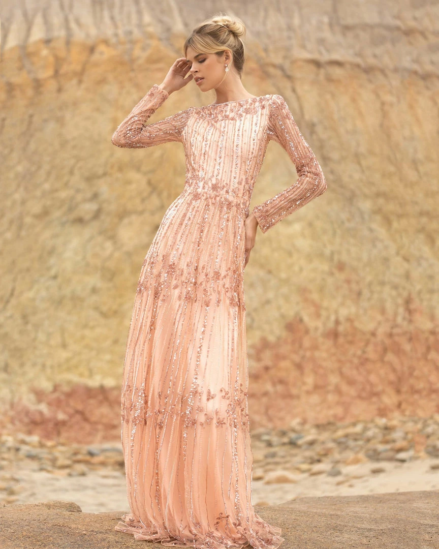 Primavera Couture 3685 This long beaded evening gown has a bateau neckline and long embellished sleeves. The A line design is beaded to the floor and has a boho tone.