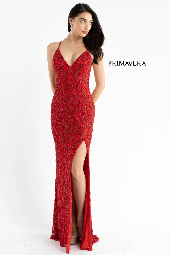 Primavera Couture 3721 A fully hand beaded long prom dress with details unlike any others. The beaded design is sure to flatter as you stroll down your own red carpet. This evening gown has a v neckline and a crisscross open back with a side slit and sweeping train.