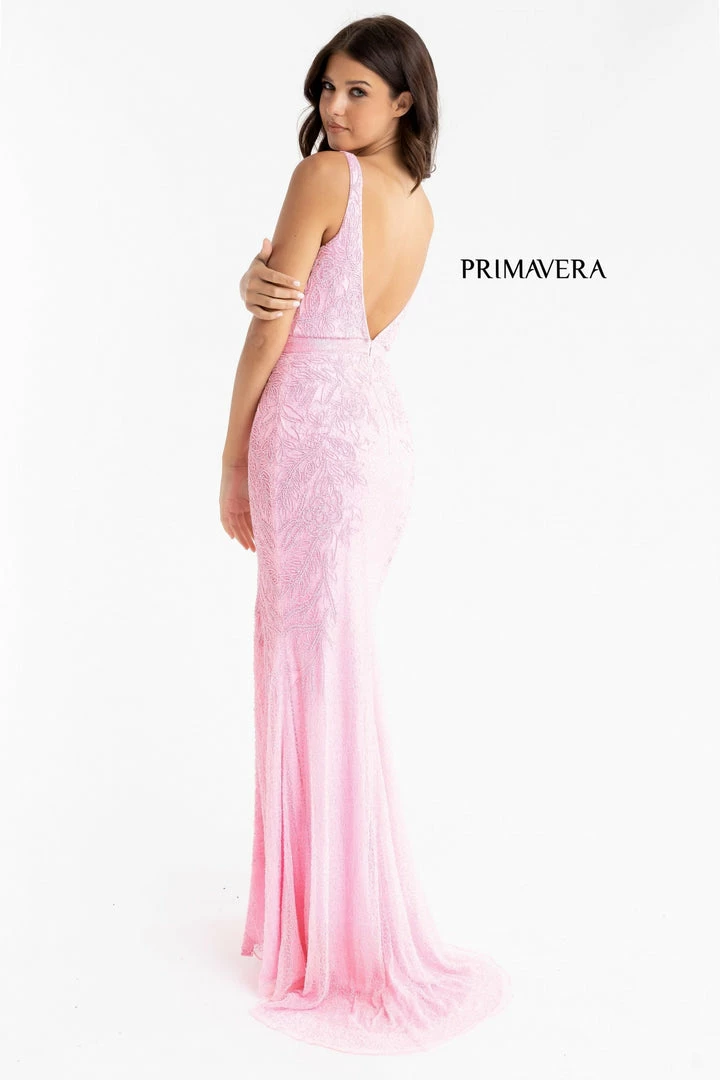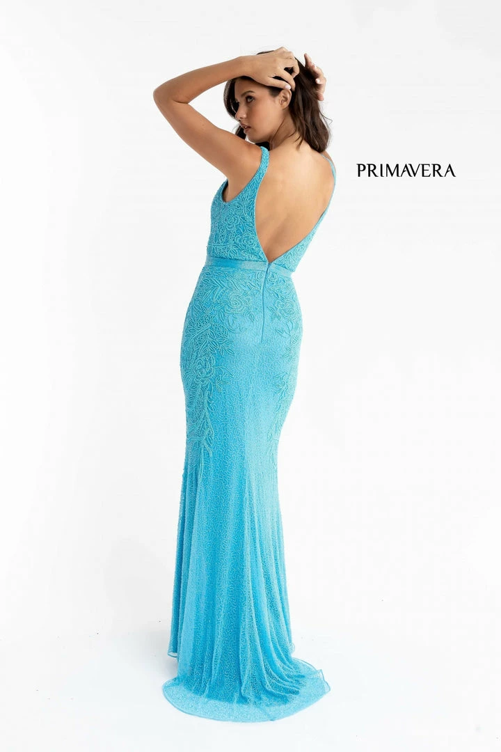Primavera Couture 3725 This is a long floral beaded prom dress with a v neckline, wide straps and a mid v open back. The bodice is beaded with floral details to the thin horizontal waist. The pattern continues down the sides of the dress and finishes in tiny bugle beading, with a slit and a sweeping train.