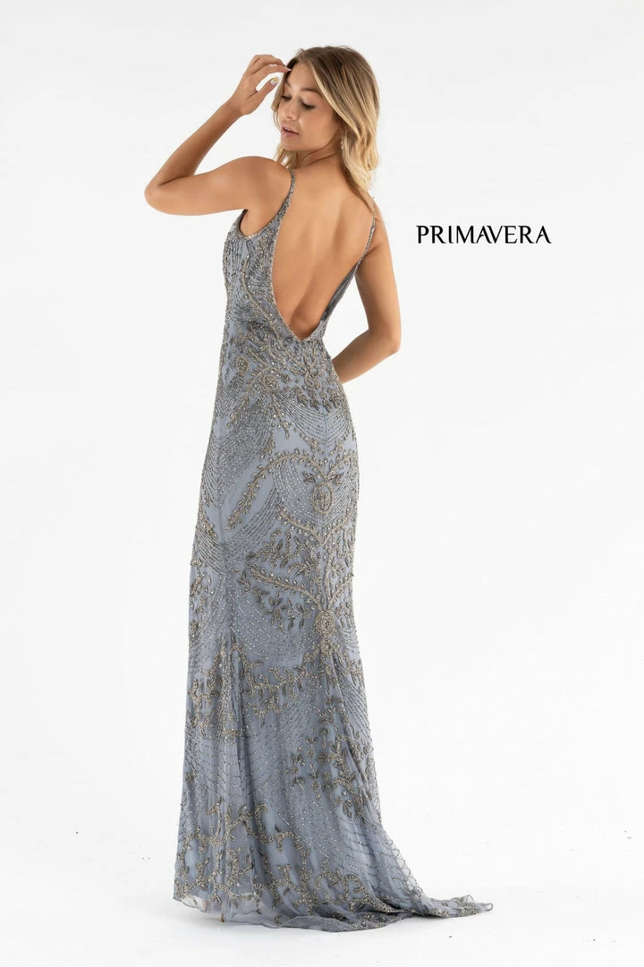 Primavera Couture 3733 This is a long Prom, Pageant and Formal Evening Dress with an exquisitely detailed beading in the form of royalty. It has a V neckline and a side slit with a sweeping train.Â