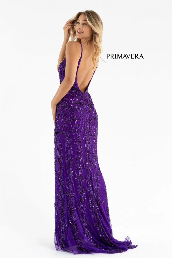 Primavera Couture 3749 This beautiful prom dress is beaded with sequins all over on the top and they flow in streams down the floor length skirt. The evening gown has a v neckline and is backless and has an extended sweeping train, making it an excellent choice for pageants, reception dress or bridal gown.