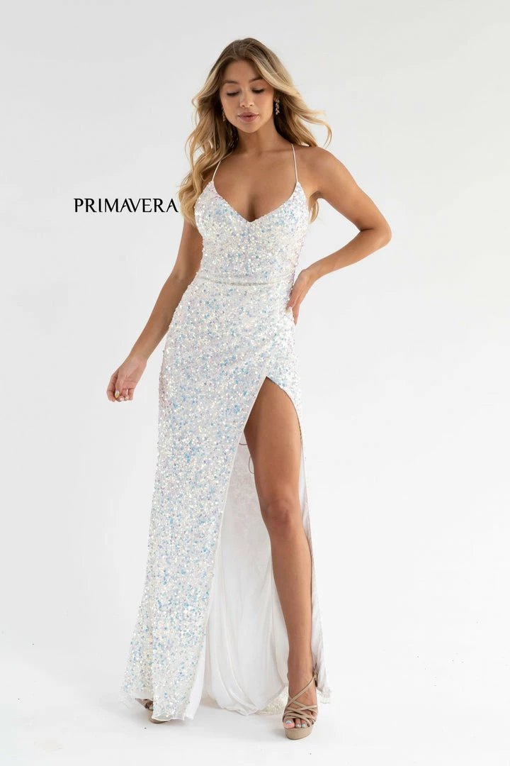 Primavera Couture 3791 Exclusive Prom Dress. This is an all sequins prom dress with a V neckline and spaghetti straps that lace up and tie in the open back. It has a wrap style side slit and a sweeping train.