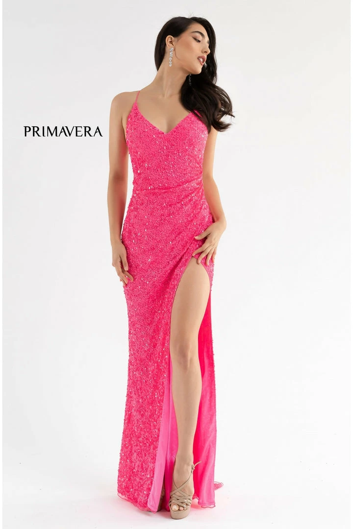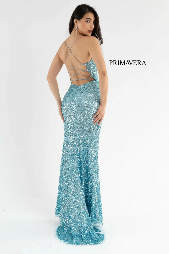 Primavera Couture 3791 Exclusive Prom Dress.Β This is an all sequins prom dress with a V neckline and spaghetti straps that lace up and tie in the open back.Β It has a wrap style side slit and a sweeping train.