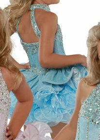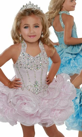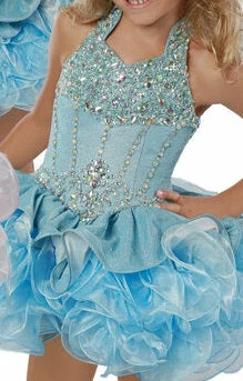 Ritzee Girls B282 is a glitter stretch shimmer Fabric material. Embellished top with AB Rhinestone Crystal Accents with a collar leading to an open cutout back. Lush Ruffle Layered Cupcake pageant Skirt. 282