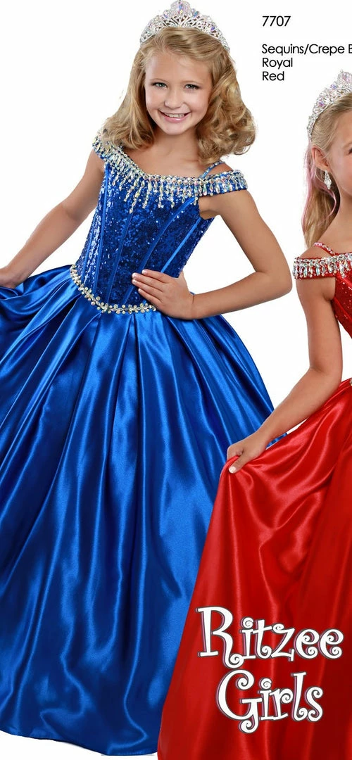 Ritzee Girls 7707 is a long 2020 Satin Ballgown Pageant Dress. This Long Pleated satin ballgown skirt is stage worthy! Sequin Embellished Bodice with boning, Basque Waistline with crystal rhinestone embellishments. off the Shoulder Rhinestone embellished straps leading to an open cutout back with crystal tassels.