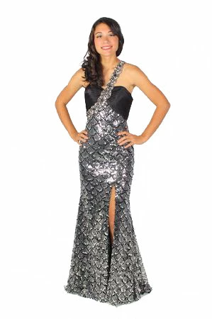 Another truly unique gown that will have all eyes on you, Riva Design R6490 is truly dazzling. The sweetheart neckline will charm those who lay eyes upon it while the shimmering asymmetrical strap leading into a gorgeous metallic patterned dress with an alluring side slit will make the evening truly yours.