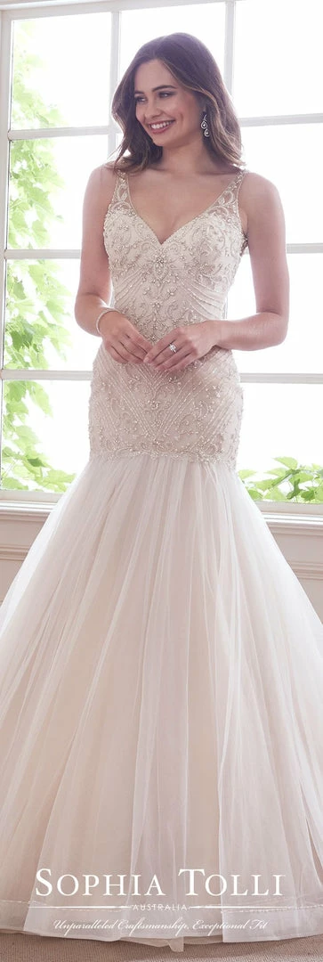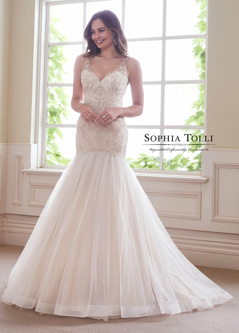 Sophia Tolli Y21811 KYANITE This Sophia Tolli Y 21811 Kyanite trumpet-style wedding gown has an intricately beaded bodice, with illusion straps edging the V-neckline and open scoop back. The gathered tulle skirt begins on the drop waist, and flows to a beaded horsehair hem and chapel train. Diamante buttons trim the back zipper closure. Oh-so-opulent sleeveless misty tulle trumpet gown Kyanite features hand-beaded illusion sheer shoulder straps that cascade into a low scoop back with a zipper trimmed with diamante buttons, a V-neckline over a richly embellished sweetheart bodice with delicate beading and embroidered detail, a clean look tulle skirt that’s gathered at the dropped waist and finished with a wide horsehair hem trimmed with beading and a chapel train. Wedding Dress Bridal Gown Fit & Flare with Train.
