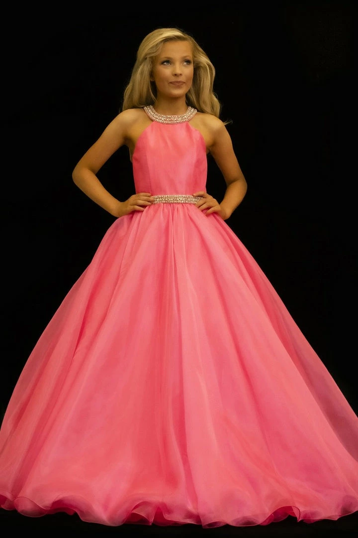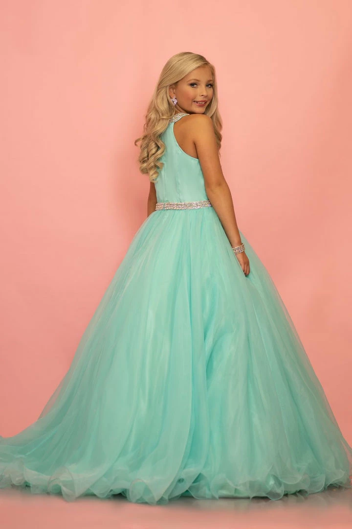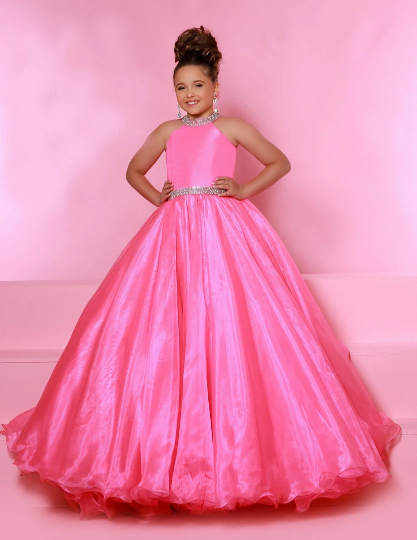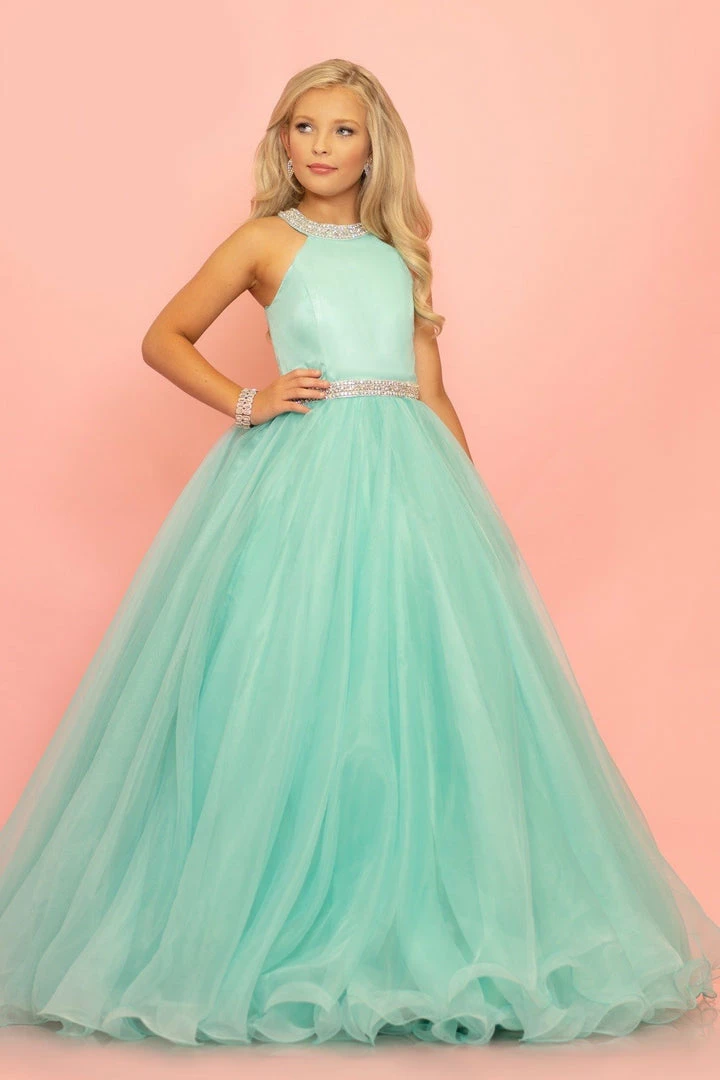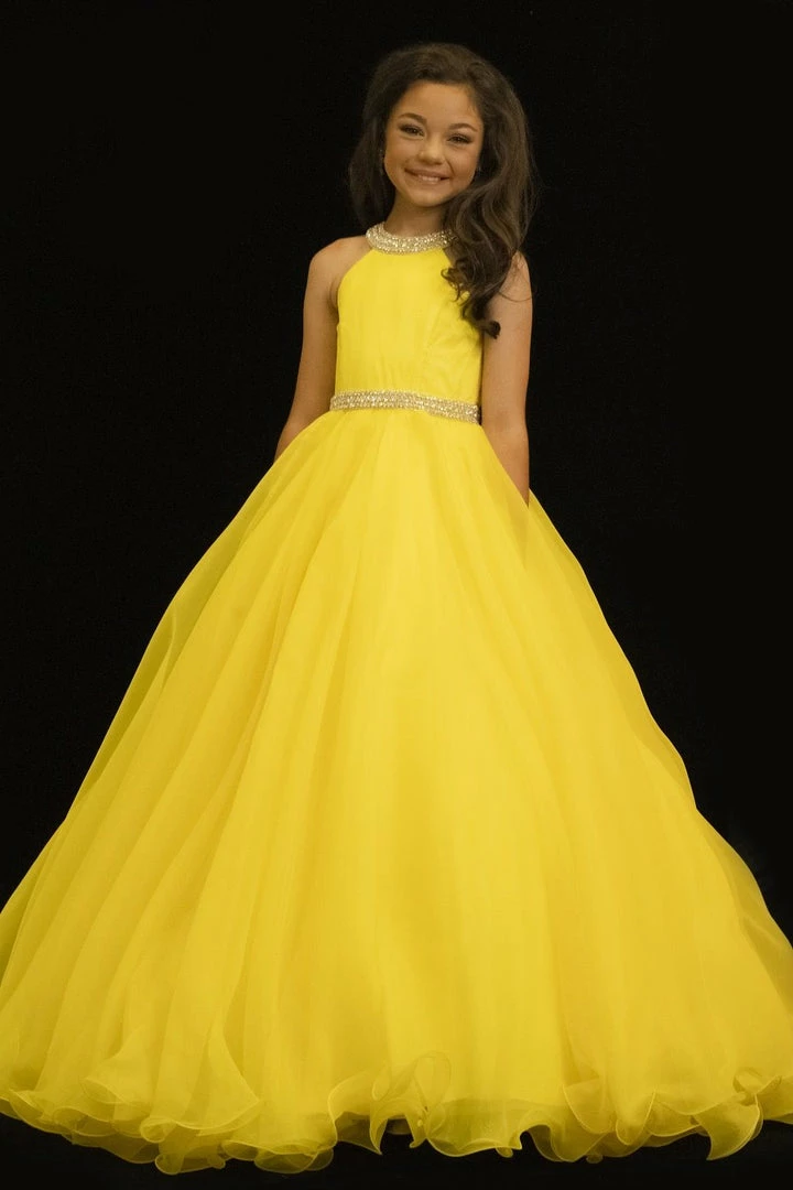 Sugar Kayne C114 by Johnathan Kayne is an Organza Girls A Line Pageant Dress. Featuring a satin lining this high neckline is Embellished with crystal rhinestone accents. The waist line is broken with a crystal bling belt. The lush Ball gown skirt features a horse hair trim. Glide across the stage in the classic beauty!