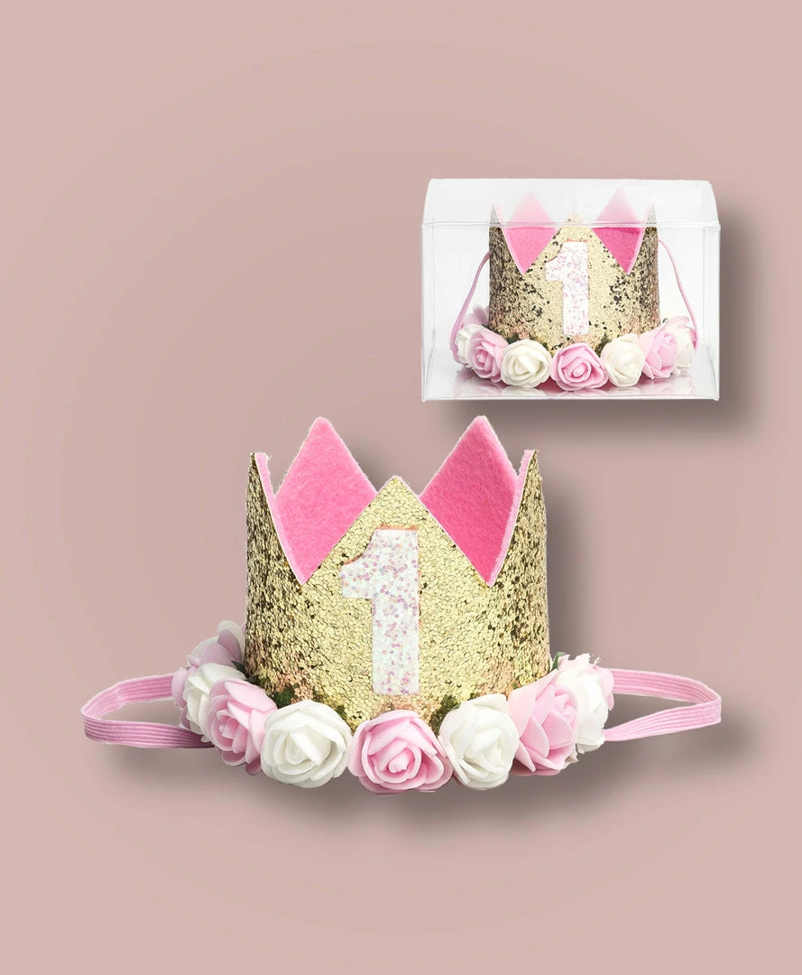 Sweet Wink –Â The Gold Blush #1 Flower Crown is the perfect addition to any first birthday! This fun and festive flower crown makes a great birthday present or is an adorable way to dress up your little one for a cake smash, birthday party, or Instagram photo.