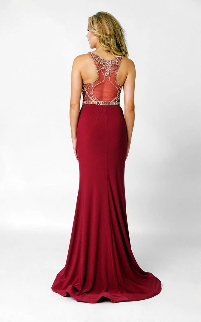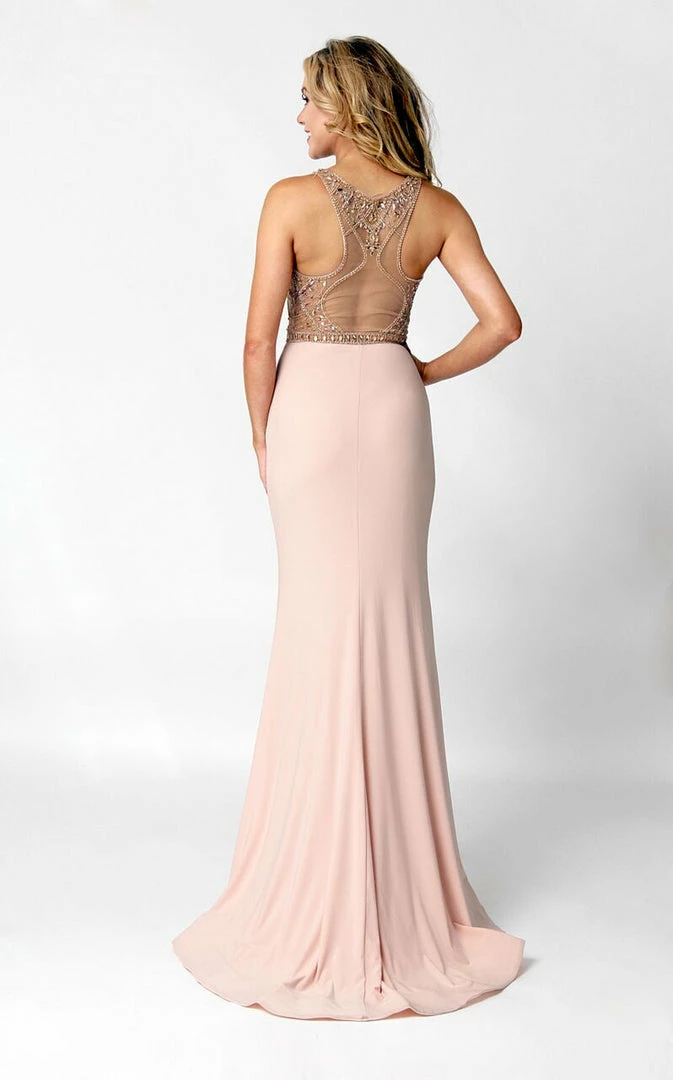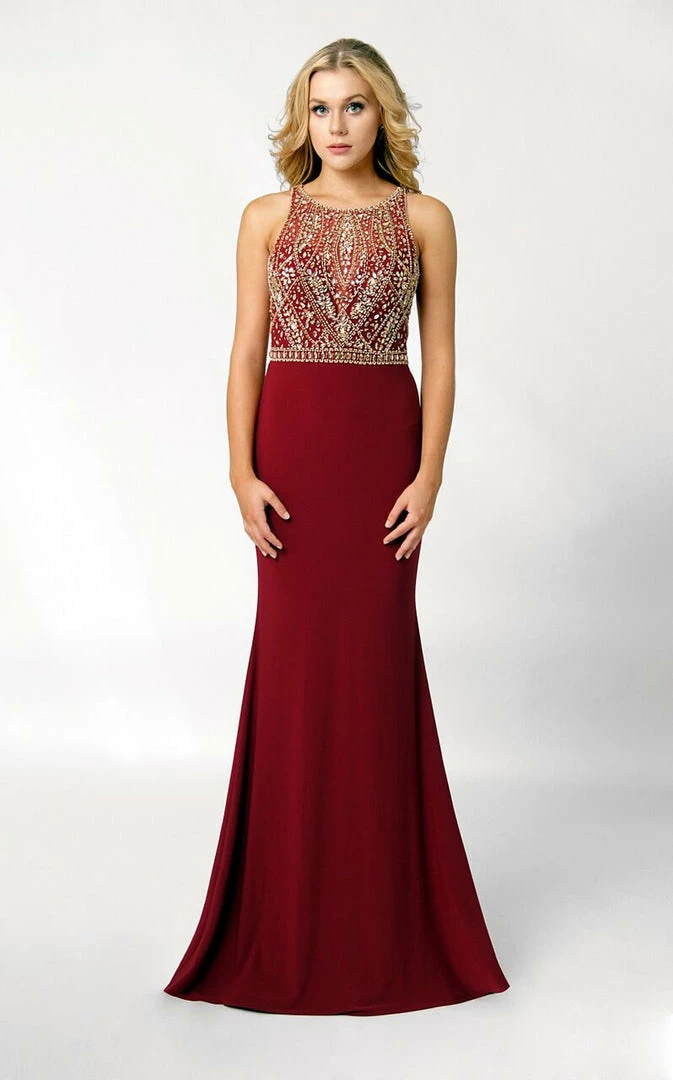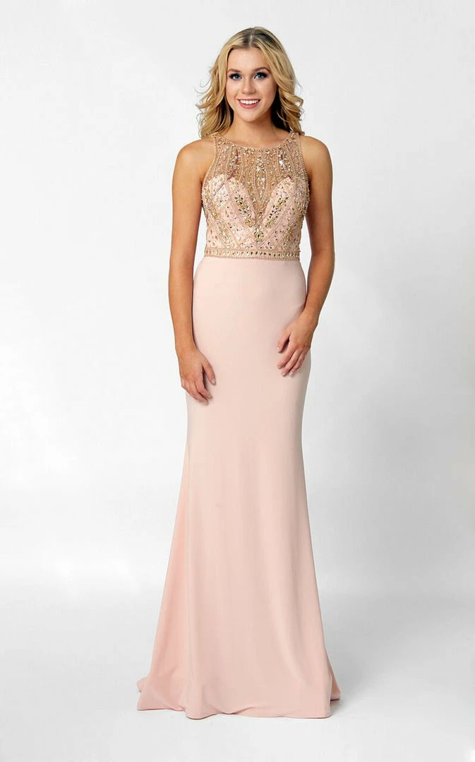 Swing Prom 3463 sleeveless Sheer Embellished high neckline beaded bodice and jersey Fit & Flare gown. illusion plunging neckline formal evening gown.Â