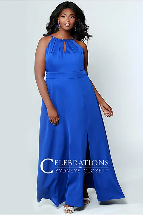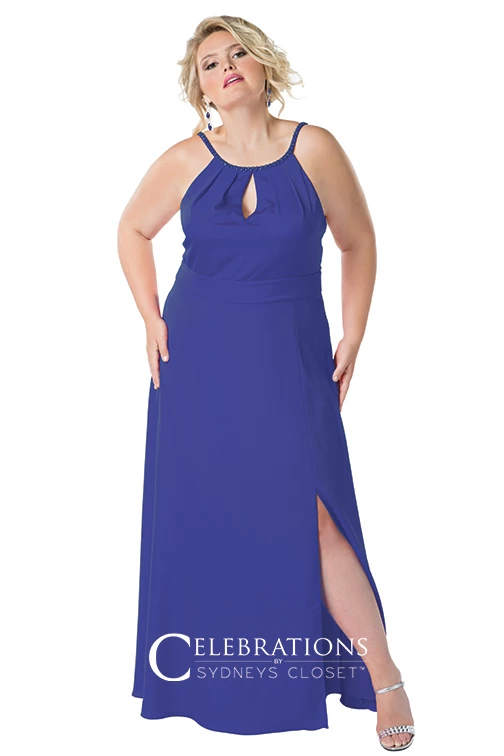 Sydney’s Closet CE1803. This stunning evening dress features a fitted pleated key-hole bodice. The dress is sleeveless, but has tone-on-tone, beaded spaghetti straps above a scoop neckline. Constructed in stretch satin, its A-line silhouette flows to the floor. The dress has a natural waistline with a center-back zipper, and comes fully lined. Flatter your figure with this eccentric design by Sydney’s Closet design.