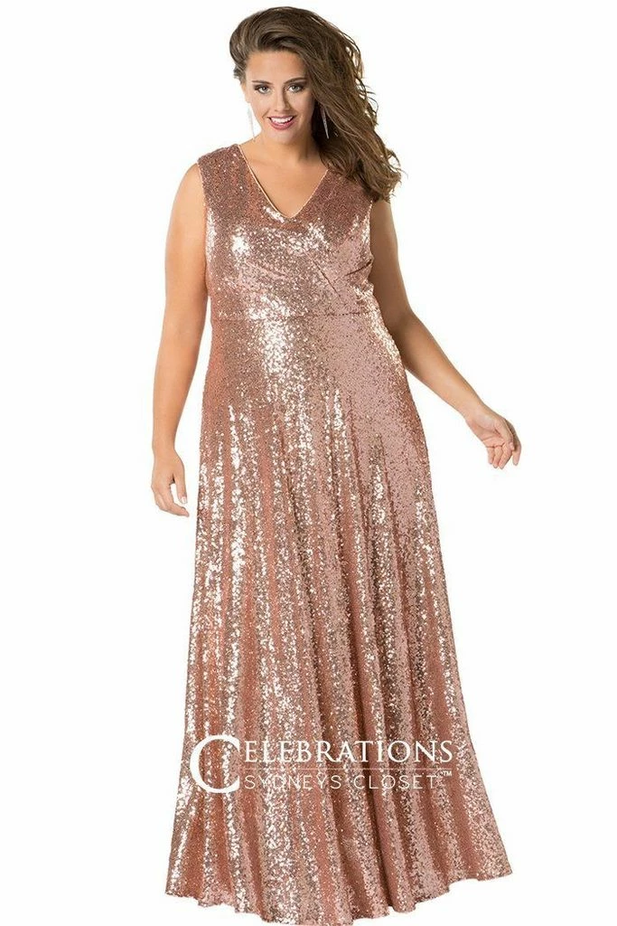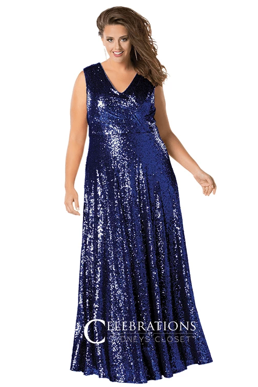 Sydney’s Closet CE1801 – Long Sequin Plus Size Prom Dress. Look red-carpet ready in this glamorous plus size floor-length sequin evening gown. This contemporary sleeveless sequin gown design features bra-friendly straps and a sexy V-neckline. Soft knit lining stretches for an oh-so-comfy fit! Soft-draped bodice accentuates your curves. You’ll be photographed like a movie star at Prom, a Military Ball, or Gala. City Lights