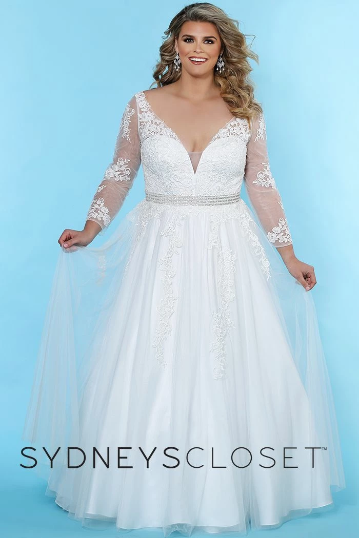 Sydney’s Closet SC5234 Cheryl Lynn Be a beautiful plus size bride in a floral lace embroidered informal wedding dress in simple, modern A-line design. Magnificent hand beaded belt accentuates your curves. Deep V-neck adds a modern design element. Lace appliques with clear sequins create just a hint of sparkle in the bodice, sleeves and tulle skirt. Designer Sydney’s Closet Style SC 5234 for full figure brides sizes 14 to 40.